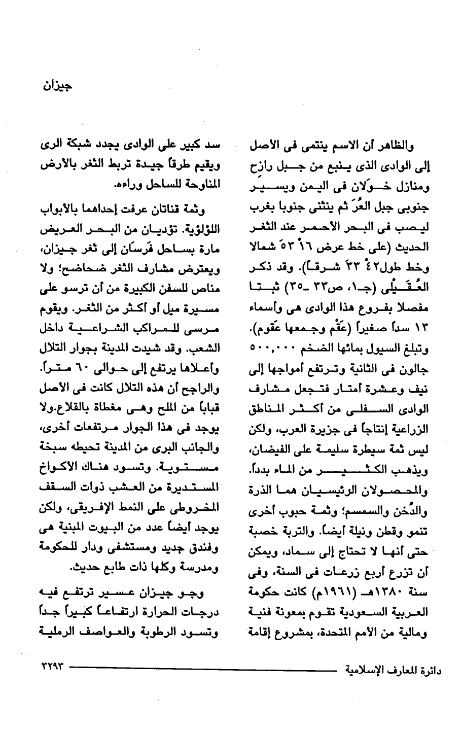والظاهر أن الاسم ينتمى في الأصل إلى الوادي الذي ينبع من جبل رازِح ومنازل خوَلان في اليمن ويسير جنوبى جبل العُرَ ثم ينثنى جنوبا بغرب ليصب في البحر الأحمر عند الثغر الحديث (على خط عرض 16 ْ 53 َ شمالا وخط 42 ْ 33 َ شرقًا). وقد ذكر العُقَيْلي (جـ 1، ص 33 - 35) ثبتا مفصلا بفروع هذا الوادي هي وأسماء 13 سدًا صغيرًا (عَقْم وجمعها عَقوم). وتبلغ السيول بمائها الضخم 500.000 جالون في الثانية وترتفع أمواجها إلى نيف وعشرة أمتار فتجعل مشارف الوادي السفلى من أكثر المناطق الزراعية إنتاجًا في جزيرة العرب، ولكن ليس ثمة سيطرة سليمة على الفيضان، ويذهب الكثير من الماء بددًا. والمحصولان الرئيسيان هما الذرة والدُخن والسمسم؛ وثمة حبوب أخرى تنمو وقطن ونيلة أيضًا. والتربة خصبة حتى أنها لا تحتاج إلى سماد، ويمكن أن تزرع أربع زرعات في السنة، وفي سنة 1380 هـ (1961 م) كانت حكومة العربية السعودية تقوم بمعونة فنية ومالية من الأمم المتحدة، بمشروع إقامة سد كبير على الوادي يجدد شبكة الرى ويقيم طرقًا جيدة تربط الثغر بالأرض المناوحة للساحل وراءه.