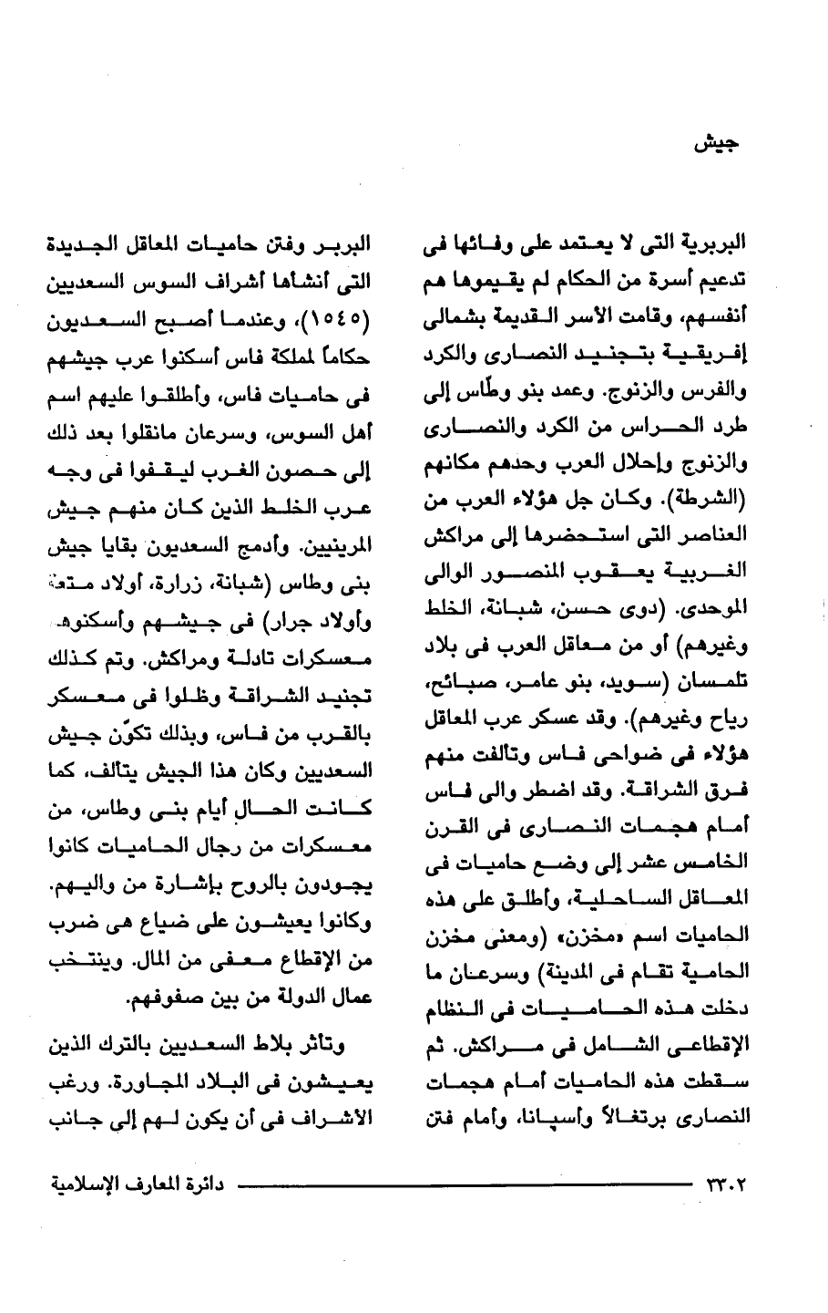 البربرية التي لا يعتمد على وفائها في تدعيم أسرة من الحكام لم يقيموها هم أنفسهم، وقامت الأسر القديمة بشمالى إفريقية بتجنيد النصارى والكرد والفرس والزنوج. وعمد بنو وطّاس إلى طرد الحراس من الكرد والنصارى والزنوج وإحلال العرب وحدهم مكانهم (الشرطة). وكان جل هؤلاء العرب من العناصر التي استحضرها إلى مراكش الغربية يعقوب المنصور الوالى الموحدى. (دوى حسن، شبانة، الخلط وغيرهم) أو من معاقل العرب في بلاد تلمسان (سويد، بنو عامر، صبائح، رياح وغيرهم). وقد عسكر عرب المعاقل هؤلاء في ضواحى فاس وتألفت منهم فرق الشراقة. وقد اضطر والى فاس أمام هجمات النصارى في القرن الخامس عشر إلى وضع حاميات في المعاقل الساحلية، وأطلق على هذه الحاميات اسم "مخزن" (ومعنى مخزن الحامية تقام في المدينة) وسرعان ما دخلت هذه الحاميات في النظام الإقطاعى الشامل في مراكش. ثم سقطت هذه الحاميات أمام هجمات النصارى برتغالًا وأسبانا، وأمام فتن البربر وفق حاميات المعاقل الجديدة التي أنشأها أشراف السوس السعديين (1545)، وعندما أصبح السعديون حكامًا لمملكة فاس أسكنوا عرب جيشهم في حاميات فاس، وأطلقوا عليهم اسم أهل السوس، وسرعان ما نقلوا بعد ذلك إلى حصون الغرب ليقفوا في وجه عرب الخلط الذين كان منهم جيش المرينيين. وأدمج السعديون بقايا جيش بنى وطاس (شبانة، زرارة، أولاد متعة وأولاد جرار) في جيشهم وأسكنوه معسكرات تادلة ومراكش. وتم كذلك تجنيد الشراقة وظلوا في معسكر بالقرب من فاس، وبذلك تكوّن جيش السعديين وكان هذا الجيش يتألف، كما كانت الحال أيام بنى وطاس، من معسكرات من رجال الحاميات كانوا يجودون بالروح بإشارة من واليهم. وكانوا يعيشون على ضياع هى ضرب من الإقطاع معفى من المال. وينتخب عمال الدولة من بين صفوفهم.