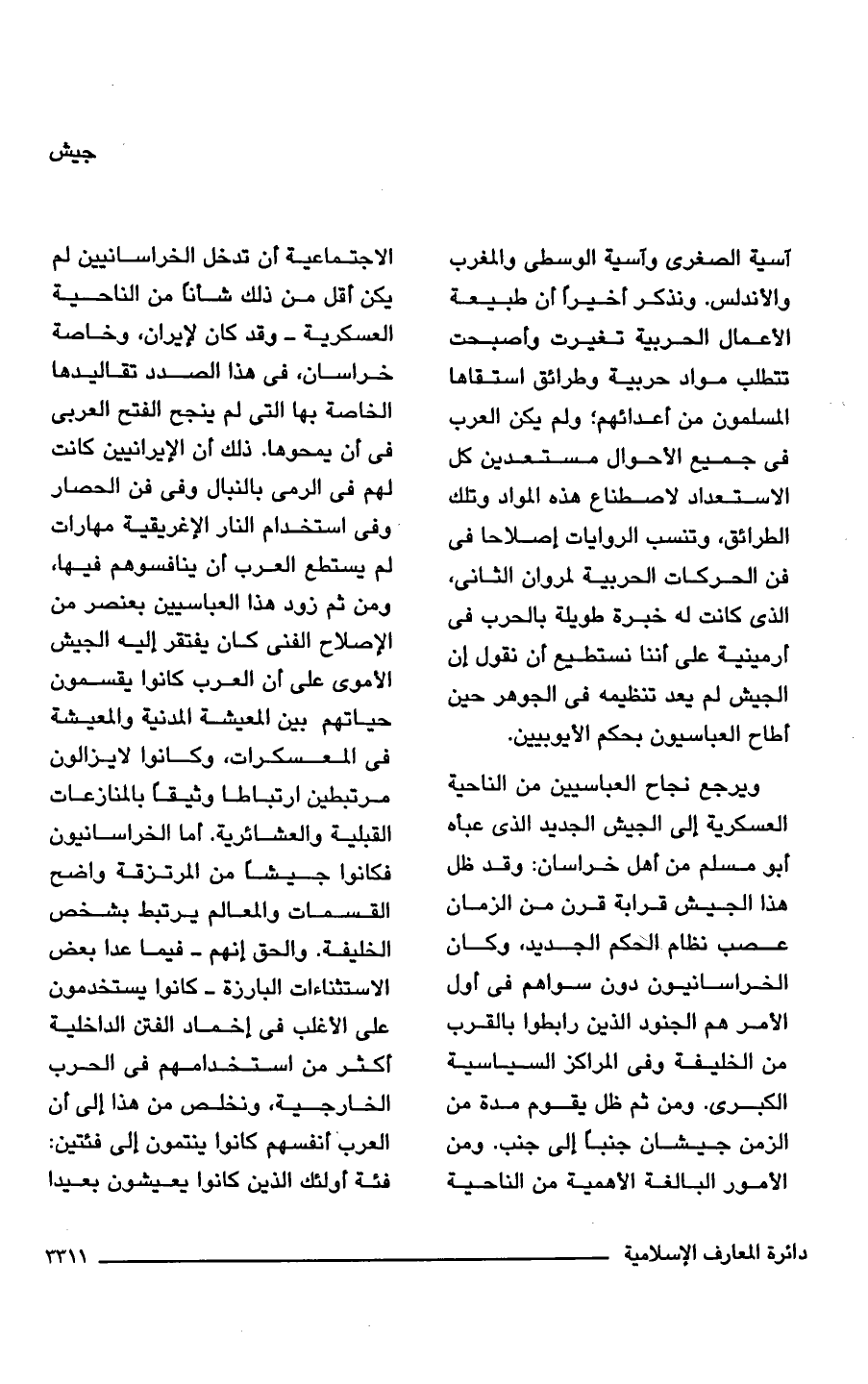 ويرجع نجاح العباسيين من الناحية العسكرية إلى الجيش الجديد الذي عبأه أبو مسلم من أهل خراسان: وقد ظل هذا الجيش قرابة قرن من الزمان عصب نظام الحكم الجديد، وكان الخراسانيون دون سواهم في أول الأمر هم الجنود الذين رابطوا بالقرب من الخليفة وفي المراكز السياسية الكبرى. ومن ثم ظل يقوم مدة من الزمن جيشان جنبًا إلى جنب. ومن الأمور البالغة الأهمية من الناحية الاجتماعية أن تدخل الخراسانيين لم يكن أقل من ذلك شأنًا من الناحية العسكرية - وقد كان لإيران، وخاصة خراسان، في هذا الصدد تقاليدها الخاصة بها التي لم ينجح الفتح العربى في أن يمحوها. ذلك أن الإيرانيين كانت لهم في الرمى بالنبال وفى فن الحصار وفى استخدام النار الإغريقية مهارات لم يستطع العرب أن ينافسوهم فيها، ومن ثم زود هذا العباسيين بعنصر من الإصلاح الفنى كان يفتقر إليه الجيش الأموى على أن العرب كانوا يقسمون حياتهم بين المعيشة المدنية والمعيشة في المعسكرات، وكانوا لا يزالون مرتبطين ارتباطا وثيقًا بالمنازعات القبلية والعشائرية. أما الخراسانيون فكانوا جيشًا من المرتزقة واضح القسمات والمعالم يرتبط بشخص الخليفة. والحق إنهم - فيما عدا بعض الاستثناءات البارزة - كانوا يستخدمون على الأغلب في إخماد الفتن الداخلية أكثر من استخدامهم في الحرب الخارجية، ونخلص من هذا إلى أن العرب أنفسهم كانوا ينتمون إلى فئتين: فئة أولئك الذين كانوا يعيشون بعيدا