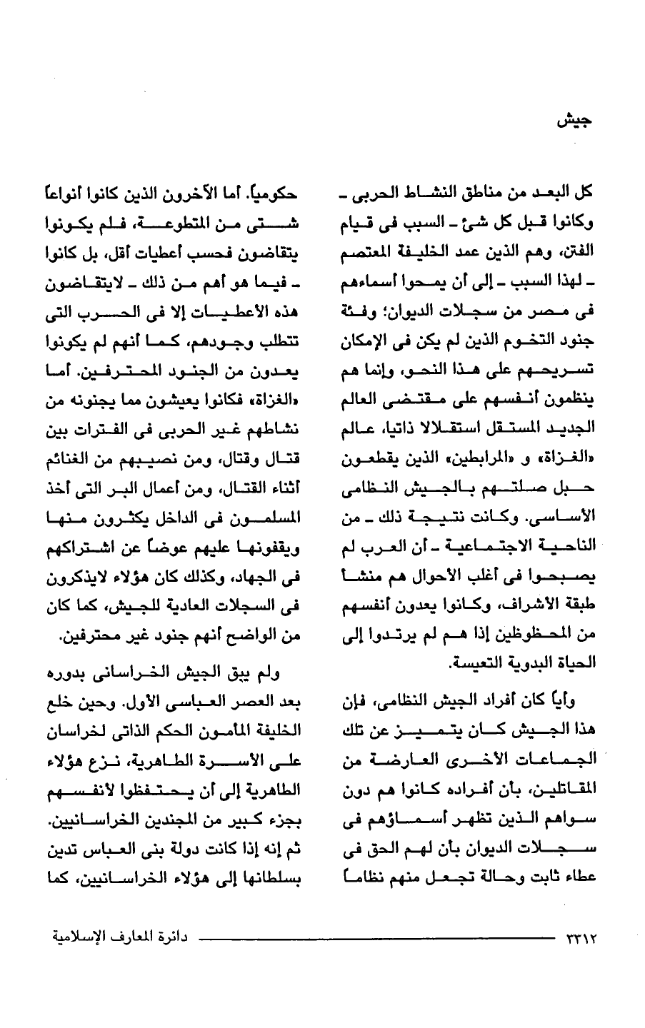 وأيًا كان أفراد الجيش النظامى، فإن هذا الجيش كان يتميز عن تلك الجماعات الأخرى العارضة من المقاتلين، بأن أفراده كانوا هم دون سواهم الذين تظهر أسماؤهم في سجلات الديوان بأن لهم الحق في عطاء ثابت وحالة تجعل منهم نظامًا حكوميًا. أما الآخرون الذين كانوا أنواعًا شتى من المتطوعة، فلم يكونوا يتقاضون فحسب أعطيات أقل، بل كانوا - فيما هو أهم من ذلك - لا يتقاضون هذه الأعطيات إلا في الحرب التي تتطلب وجودهم، كما أنهم لم يكونوا يعدون من الجنود المحترفين. أما "الغزاة" فكانوا يعيشون مما يجنونه من نشاطهم غير الحربى في الفترات بين قتال وقتال، ومن نصيبهم من الغنائم أثناء القتال، ومن أعمال البر التي أخذ المسلمون في الداخل يكثرون منها ويقفونها عليهم عوضًا عن اشتراكهم في الجهاد، وكذلك كان هؤلاء لا يذكرون في السجلات العادية للجيش، كما كان من الواضح أنهم جنود غير محترفين.