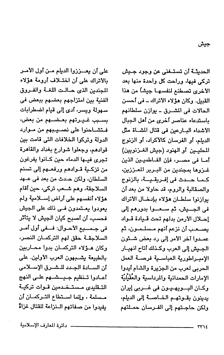الحديثة أن تستغنى عن وجود جيش تركى فيها، وراحت كل واحدة منها بعد الأخرى تصطنع لنفسها جيشًا من هذا القبيل. وكان هؤلاء الأتراك - في أحسن الحالات في المشرق - يوازن سلطانهم باستدعاء عناصر أخرى من أهل الجبال الأشداء البارعين في قتال المشاة مثل الديلم، أو الفرسان كالأكراد، أو الزنوج المحليين أو الهنود (جيش الغزنويين) أما في مصر، فإن الفاطميين الذين غزوها بمجندين من البربر المعززين، كما حدث في إفريقية، بالزنوج والصقالبة والروم، قد حاولا من بعد أن يوازنوا سلطان هؤلاء بإدخال الأتراك في الجيش، ثم سعوا بدورهم إلى إحلال الأرمن بدلهم تحت قيادة قواد يصعب أن نزعم أنهم مسلمون، ثم عمدوا آخر الأمر إلى رد بعض شئون الجيش إلى العرب وكذلك أتاح انهيار الإمبراطورية العباسية فرصة العمل الحربى لعرب من الجزيرة والشام أيدوا الإمارات الحمدانية والمرداسية والعُقَيْليَة وكان البويهيون في غربى إيران يدينون بقوتهم الخاصة إلى الديلم، ولكن حاجتهم إلى الفرسان حملتهم على أن يعززوا الديلم من أول الأمر بالأتراك على أن اختلاف أرومة هؤلاء المجندين الذي حالت اللغة والفروق الفنية بين امتزاجهم بعضهم ببعض في سهولة ويسر، أدى إلى قيام اضطرابات بسبب غيرتهم بعضهم من بعض، فتشاحنوا على نصيبهم من موارد الدولة وتركوا الخلافات التي قامت بين قوادهم، وجعلوا شوارع بغداد والقاهرة تجرى فيها الدماء حين كانوا يفرغون من تزكية قوادهم ورفعهم إلى تسنم السلطان، ولكن حدث من بعد في عهد السلاجقة، وهم شعب تركى، حين أقام هؤلاء أنفسهم على أراض إسلامية ولم يعودوا يعتمدون في ذلك على الجيش فحسب، أن أصبح كيان الجيش لا يتأثر في جميع الأحوال: ففى أول أمر السلاجقة حقق لهم التركمان النصر، وكان هؤلاء التركمان بدوا محاربين بالطبيعة يشبهون العرب الأولين. على أن السادة الجدد للشرق الإسلامى أعادوا تنظيم جيشهم على النهج التقليدى مستخدمين قوات تركية مسلمة، وإنما استطاع التركمان أن يفيدوا من صفاتهم النزاعة للقتال غزاة