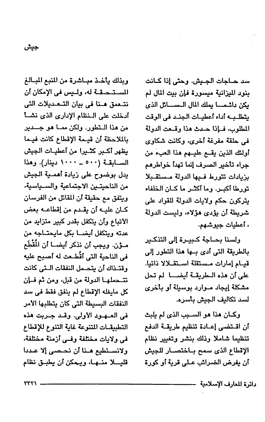 وكان هذا هو السبب الذي لم يلبث أن اقتضى إعادة تنظيم طريقة الدفع تنظيما شاملا وذلك بنشر وتغيير نظام الإقطاع الذي سمح باختصار للجيش أن يفرض الضرائب على قرية أو كورة وبذلك يأخذ مباشرة من المنبع المبالغ المستحقة له، وليس في الإمكان أن نتعمق هنا في بيان التعديلات التي أدخلت على النظام الإدارى الذي نشأ من هذا التطور. ولكن مما هو جدير بالملاحظة أن قيمة الإقطاع كانت فيما يظهر أكبر كثيرا من أعطيات الجيش السابقة (500 - 1000 دينار). وهذا يدل بوضوح على زيادة أهمية الجيش من الناحيتين الاجتماعية والسياسية، ويتفق مع حقيقة أن المقاتل من الفرسان كان عليه أن يقدم من إقطاعه بعض الأتباع وأن يتكفل بقدر كبير متزايد من عدته ويتكفل أيضا بكل ما يحتاجه من مؤن. ويجب أن نذكر أيضا أن المُقْطَع في الناحية التي أقُطعت له اصبح عليه وقتذاك أن يتحمل النفقات التي كانت تتحملها الدولة من قبل، ومن ثم فإن كل ما يغله الإقطاع لم ينفق فقط في سد النفقات البسيطة التي كان يتطلبها الأمر في العهود الأولى. وقد جربت هذه التطبيقات المتنوعة غاية التنوع للإقطاع في ولايات مختلفة وفى أزمنة مختلفة، ولا نستطيع هنا أن نحصى إلا عددا قليلا منها، ويمكن أن يطبق نظام