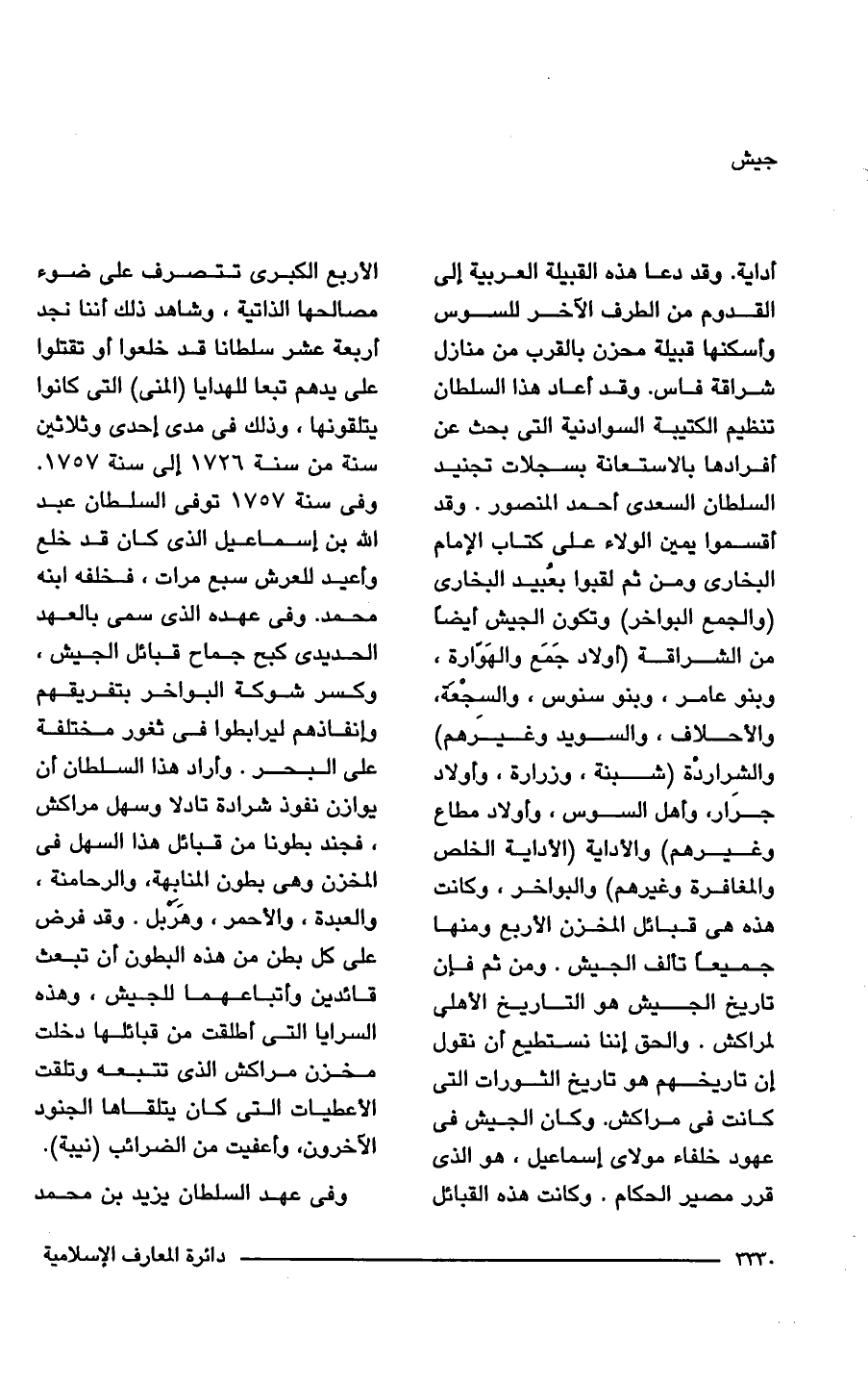 أداية. وقد دعا هذه القبيلة العربية إلى القدوم من الطرف الآخر للسوس وأسكنها قبيلة محزن بالقرب من منازل شراقة فاس. وقد أعاد هذا السلطان تنظيم الكتيبة السوادنية التي بحث عن أفرادها بالاستعانة بسجلات تجنيد السلطان السعدى أحمد المنصور. وقد أقسموا يمين الولاء على كتاب الإمام البخاري ومن ثم لقبوا بعُبيد البخاري (والجمع البواخر) وتكون الجيش أيضًا من الشراقة (أولاد جَمَع والهَوّارة، وبنو عامر، وبنو سنوس، والسِجْعَة، والأحلاف، والسويد وغيرهم) والشراردْة (شبنة، وزرارة، وأولاد جرَار، وأهل السوس، وأولاد مطاع وغيرهم) والأداية (الأداية الخلص والمغافرة وغيرهم) والبواخر، وكانت هذه هى قبائل المخزن الأربع ومنها جميعًا تألف الجيش. ومن ثم فإن تاريخ الجيش هو التاريخ الأهلى لمراكش. والحق إننا نستطيع أن نقول إن تاريخهم هو تاريخ الثورات التي كانت في مراكش. وكان الجيش في عهود خلفاء مولاى إسماعيل، هو الذي قرر مصير الحكام. وكانت هذه القبائل الأربع الكبرى تتصرف على ضوء مصالحها الذاتية، وشاهد ذلك أننا نجد أربعة عشر سلطانا قد خلعوا أو تقتلوا على يدهم تبعا للهدايا (المنى) التي كانوا يتلقونها، وذلك في مدى إحدى وثلاثين سنة من سنة 1726 إلى سنة 1757. وفى سنة 1757 توفى السلطان عبد الله بن إسماعيل الذي كان قد خلع وأعيد للعرش سبع مرات، فخلفه ابنه محمد. وفى عهده الذي سمى بالعهد الحديدى كبح جماح قبائل الجيش، وكسر شوكة البواخر بتفريقهم وإنفاذهم ليرابطوا في ثغور مختلفة على البحر. وأراد هذا السلطان أن يوازن نفوذ شرادة تادلا وسهل مراكش، فجند بطونا من قبائل هذا السهل في المخزن وهى بطون المنابهة، والرحامنة، والعبدة، حمر، وهَرَبْل. وقد فرض على كل بطن من هذه البطون أن تبعث قائدين وأتباعهما للجيش، وهذه السرايا التي أطلقت من قبائلها دخلت مخزن مراكش الذي تتبعه وتلقت الأعطيات التي كان يتلقاها الجنود الآخرون، وأعفيت من الضرائب (نيبة).