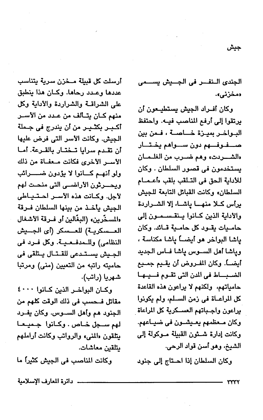 وكان السلطان إذا احتاج إلى جنود أرسلت كل قبيلة مخزن سرية يتناسب عددها وعدد رحاها. وكان هذا ينطبق على الشراقة والشراردة والأداية وكل منهم كان يتألف من عدد من الأسر أكبر بكثير من أن يندرج في جملة الجيش. وكانت الأسر التي فرض عليها أن تقدم سرايا تختار بالقرعة. أما الأسر الأخرى فكانت معفاة من ذلك ولو أنهم كانوا لا يؤدون ضرائب ويحرثون الأراضى التي منحت لهم لأجل. وكانت هذه الأسر احتياطى الجيش يأخذ من بينها السلطان فرقة "المسخّرين" (البغّالين أو فرقة الأشغال العسكرية) للعسكر (أى الجيش النظامى) وللمدفعية. وكل فرد في الجيش يستدعى للقتال يتلقى في حاميته راتبه من التعيين (منى) ومرتبا شهريا (راتب).