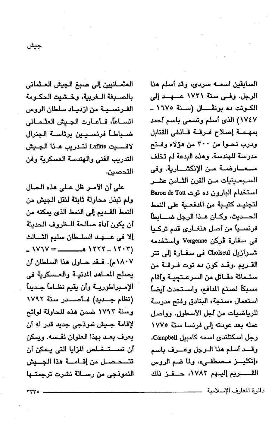 السابقين اسمه سردى، وقد أسلم هذا الرجل. وفى سنة 1731 عهد إلى الكونت ده بونفال (سنة 1675 - 1747) الذي أسلم وتسمى باسم أحمد بمهمة إصلاح فرقة قاذفى القنابل ودرب نحوا من 300 من هؤلاء وفتح مدرسة للهندسة. وهذه البدعة لم تخلف معارضة من الإنكشارية. وفى السبعينيات من القرن الثامن عشر استخدام البارون ده توت Baron de Tott لتجنيد كتيبة من المدفعية على النمط الحديث، وكان هذا الرجل ضابطًا فرنسيًا من أصل هنغارى قدم تركيا في سفارة فركن Vergenne واستخدمه شوازيل Choiseul في سفارة إلى تتر القريم. وقد كون ده توت فرقة من ستمائة مقاتل من السرعتجية وأقام مسبكًا لصنع المدافع، واستحدث أيضًا استعمال "سنجة" البنادق وفتح مدرسة للرياضيات من أجل الأسطول. وواصل عمله بعد عودته إلى فرنسا سنة 1775 رجل اسكتلندى اسمه كامبيل Campbell, وقد أسلم هذا الرجل وعرف باسم "إنكليز مصطفى"، ولما ضم الروس القريم إليهم 1783, حفز ذلك العثمانيين إلى صبغ الجيش العثمانى بالصبغة الغربية، وخشيت الحكومة الفرنسية من ازدياد سلطان الروس اتساعًا، فأعارت الجيش العثمانى ضباطًا فرنسيين برئاسة الجنرال لافيت Lafitte لتدريب هذا الجيش التدريب الفنى والهندسة العسكرية وفن التحصين.
