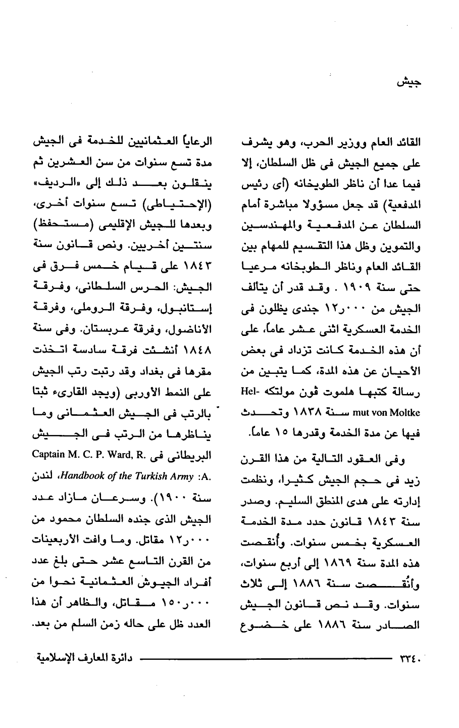 القائد العام ووزير الحرب، وهو يشرف على جميع الجيش في ظل السلطان، إلا فيما عدا أن ناظر الطويخانه (أى رئيس المدفعية) قد جعل مسؤولا مباشرة أمام السلطان عن المدفعية والمهندسين والتموين وظل هذا التقسيم للمهام بين القائد العام وناظر الطوبخانه مرعيا حتى سنة 1909. وقد قدر أن يتألف الجيش من 12,000 جندى يظلون في الخدمة العسكرية اثنى عشر عامًا، على أن هذه الخدمة كانت تزداد في بعض الأحيان عن هذه المدة، كما يتبين من رسالة كتبها هلموت فون مولتكه - Hel mut von Moltke سنة 1838 وتحدث فيها عن مدة الخدمة وقدرها 15 عامًا.