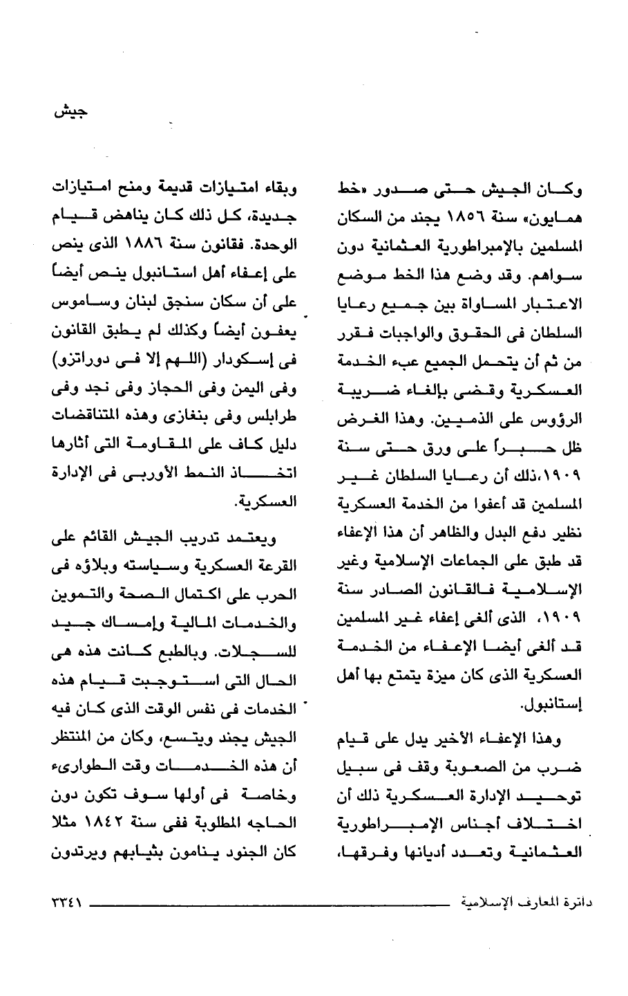 وكان الجيش حتى صدور "خط همايون" سنة 1856 يجند من السكان المسلمين بالإمبراطورية العثمانية دون سواهم. وقد وضع هذا الخط موضع الاعتبار المساواة بين جميع رعايا السلطان في الحقوق والواجبات فقرر من ثم ان يتحمل الجميع عبء الخدمة العسكرية وقضى بإلغاء ضريبة الرؤوس على الذميين. وهذا الغرض ظل حبرًا على ورق حتى سنة 1909، ذلك أن رعايا السلطان غير المسلمين قد أعفوا من الخدمة العسكرية نظير دفع البدل والظاهر أن هذا الإعفاء قد طبق على الجماعات الإسلامية وغير الإسلامية فالقانون الصادر سنة 1909، الذي ألغى إعفاء غير المسلمين قد ألغى أيضا الإعفاء من الخدمة العسكرية الذي كان ميزة يتمتع بها أهل إستانبول.