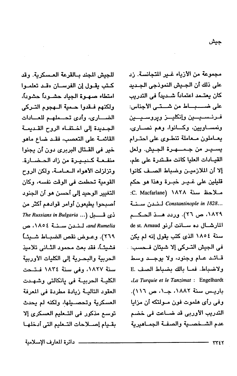 مجموعة من الأزياء غير المتجانسة. زد على ذلك ان الجيش النموذجى الجديد كان يعتمد اعتمادًا شديدًا في التدريب على ضباط من شتى الأجناس: فرنسيين وإنكليز وبروسيين ونمساويين، وكانوا، وهم نصارى، يعاملون معاملة تنطوى على احترام يسير من جمهرة الجيش. ولعل القيادات العليا كانت مقتدرة على علم، إلا أن الملازمين وضباط الصف كانوا قليلين على غير خبرة وهذا هو حكم ملاحظ سنة 1828 (C. Macfarlane: Constantinople in 1828 .. لندن سنة 1829, ص 26). وردد هذا الحكم المارشال ده سانت أرنو de st.Arnaud سنة 1854 الذي كتب يقول إنه لم يكن في الجيش التركى إلا شيئان فحسب: قائد عام وجنود، ولا يوجد وسط ولا ضباط. فما بالك بضباط الصف. E La Turquie et le Tanzimat: Engelhardt, باريس سنة 1882, جـ 1، ص 116). وفى رأى هلموت فون مولتكه أن مزايا التدريب الأوربى قد ضاعت في خضم عدم الشخصية والصفة الجماهيرية للجيش المجند بالقرعة العسكرية. وقد كتب يقول إن الفرسان "قد تعلموا امتطاء صهوة الجياد حشودًا حشودًا، ولكنهم فقدوا حمية الهجوم التركى الضارى، وأدى تحملهم للعادات الجديدة إلى اختفاء الروح القديمة القائمة على التعصب، فقد ضاع ما هو خير في القتال البربرى دون أن يجنوا منفعة كبيرة من زاد الحضارة. وتزلزلت الأهواء العامة، ولكن الروح القومية تحطمت في الوقت نفسه، وكان التغيير الوحيد إلى أحسن هو أن الجنود أصبحوا يطيعون أوامر قوادهم أكثر من ذى قبل ( ... The Russians in Bulgaria and Rumelia، لندن سنة 1854، ص 269). وعوض نقص الضباط شيئًا فشيئًا، فقد بعث محمود الثاني تلاميذ الحربية والبحرية إلى الكليات الأوربية سنة 1827، وفى سنة 1834 فتحت الكلية الحربية في بانكالتى وشهدت العقود التالية زيادة مطردة في المعرفة العسكرية وتحصيلها، ولكنه لم يحدث توسع مذكور في التعليم العسكرى إلا بقيام إصلاحات التعليم التي أدخلها