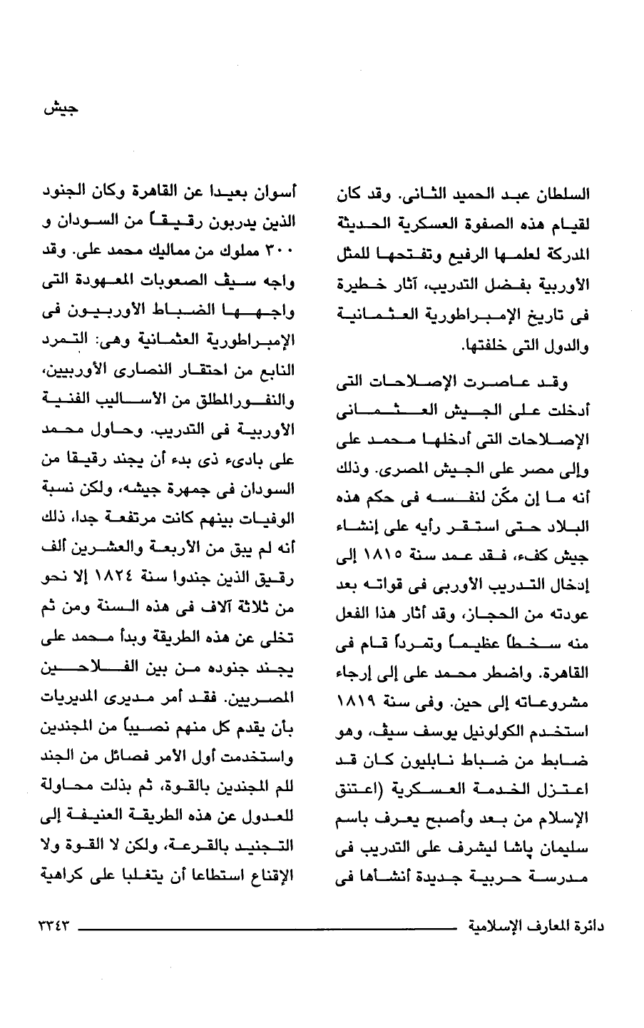 وقد عاصرت الإصلاحات التي أدخلت على الجيش العثمانى الإصلاحات التي أدخلها محمد على وإلى مصر على الجيش المصرى. وذلك أنه ما إن مكّن لنفسه في حكم هذه البلاد حتى استقر رأيه على إنشاء جيش كفء، فقد عمد سنة 1815 إلى إدخال التدريب الأوربى في قواته بعد عودته من الحجاز، وقد أثار هذا الفعل منه سخطًا عظيمًا وتمردًا قام في القاهرة. واضطر محمد على إلى إرجاء مشروعاته إلى حين. وفى سنة 1819 استخدم الكولونيل يوسف سيف، وهو ضابط من ضباط نابليون كان قد اعتزل الخدمة العسكرية (اعتنق الإسلام من بعد وأصبح يعرف باسم سليمان باشا ليشرف على التدريب في مدرسة حربية جديدة أنشأها في أسوان بعيدا عن القاهرة وكان الجنود الذين يدربون رقيقًا من السودان و 300 مملوك من مماليك محمد على. وقد واجه سيف الصعوبات المعهودة التي واجهها الضباط الأوربيون في الإمبراطورية العثمانية وهى: التمرد النابع من احتقار النصارى الأوربيين، والنفور المطلق من الأساليب الفنية الأوربية في التدريب. وحاول محمد على بادئ ذى بدء أن يجند رقيقا من السودان في جمهرة جيشه، ولكن نسبة الوفيات بينهم كانت مرتفعة جدا، ذلك أنه لم يبق من الأربعة والعشرين ألف رقيق الذين جندوا سنة 1824 إلا نحو من ثلاثة آلاف في هذه السنة ومن ثم تخلى عن هذه الطريقة وبدأ محمد على يجند جنوده من بين الفلاحين المصريين. فقد أمر مديرى المديريات بأن يقدم كل منهم نصيبًا من المجندين واستخدمت أول الأمر فصائل من الجند للم المجندين بالقوة، ثم بذلت محاولة للعدول عن هذه الطريقة العنيفة إلى التجنيد بالقرعة، ولكن لا القوة ولا الإقناع استطاعا أن يتغلبا على كراهية