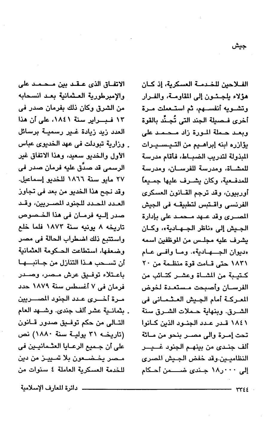 الفلاحين للخدمة العسكرية، إذ كان هؤلاء يلجئون إلى المقاومة، والفرار وتشويه أنفسهم، ثم استعملت مرة أخرى فصيلة الجند التي تُجنِّد بالقوة وبعد حملة المورة زاد محمد على يؤازره ابنه إبراهيم من التيسيرات المبذولة لتدريب الضباط، فأقام مدرسة للمشاة، ومدرسة للفرسان، ومدرسة للمدفعية، وكان يشرف عليها جميعًا أوربيون، وقد ترجم القانون العسكرى الفرنسى واقتبس لتطبيقه في الجيش المصرى وقد عهد محمد على بإدارة الجيش إلى "ناظر الجهادية"، وكان يشرف عليه مجلس من الموظفين اسمه "ديوان الجهادية". وما وافى عام 1831 حتى قامت قوة منظمة من 20 كتيبة من المشاة وعشر كتائب من الفرسان وأصبحت مستعدة لخوض المعركة أمام الجيش العثمانى في الشرق. وبنهاية حملات الشرق سنة 1841 قدر عدد الجنود الذين كانوا تحت إمرة والى مصر بنحو من مائة ألف جندى من بينهم الجنود غير النظاميين. وقد خفض الجيش المصرى إلى 18,000 جندى ضمن أحكام الاتفاق الذي عقد بين محمد على والإمبرطورية العثمانية بعد انسحابه من الشرق وكان ذلك بفرمان صدر في 13 فبراير سنة 1841، على أن هذا العدد زيد زيادة غير رسمية برسائل وزارية تبودلت في عهد الخديوى عباس الأول والخديو سعيد، وهذا الاتفاق غير الرسمى قد صدَّق عليه فرمان صدر في 27 مايو سنة 1866 للخديو إسماعيل. وقد نجح هذا الخديو من بعد في تجاوز العدد المحدد للجنود المصريين، وقد صدر إليه فرمان في هذا الخصوص تاريخه 8 يونيه سنة 1873 فلما خلع واستتبع ذلك اضطراب الحالة في مصر وضعفها، استطاعت الحكومة العثمانية أن تسحب هذا التنازل من جانبها باعتلاء توفيق عرش مصر، وصدر فرمان في 7 أغسطس سنة 1879 حدد مرة أخرى عدد الجنود المصريين بثمانية عشر ألف جندى. وشهد العام التالى من حكم توفيق صدور قانون (تاريخه 31 يولية سنة 1880) نص على أن جميع الرعايا العثمانيين في مصر يخضعون بلا تمييز من دين للخدمة العسكرية العاملة 4 سنوات من