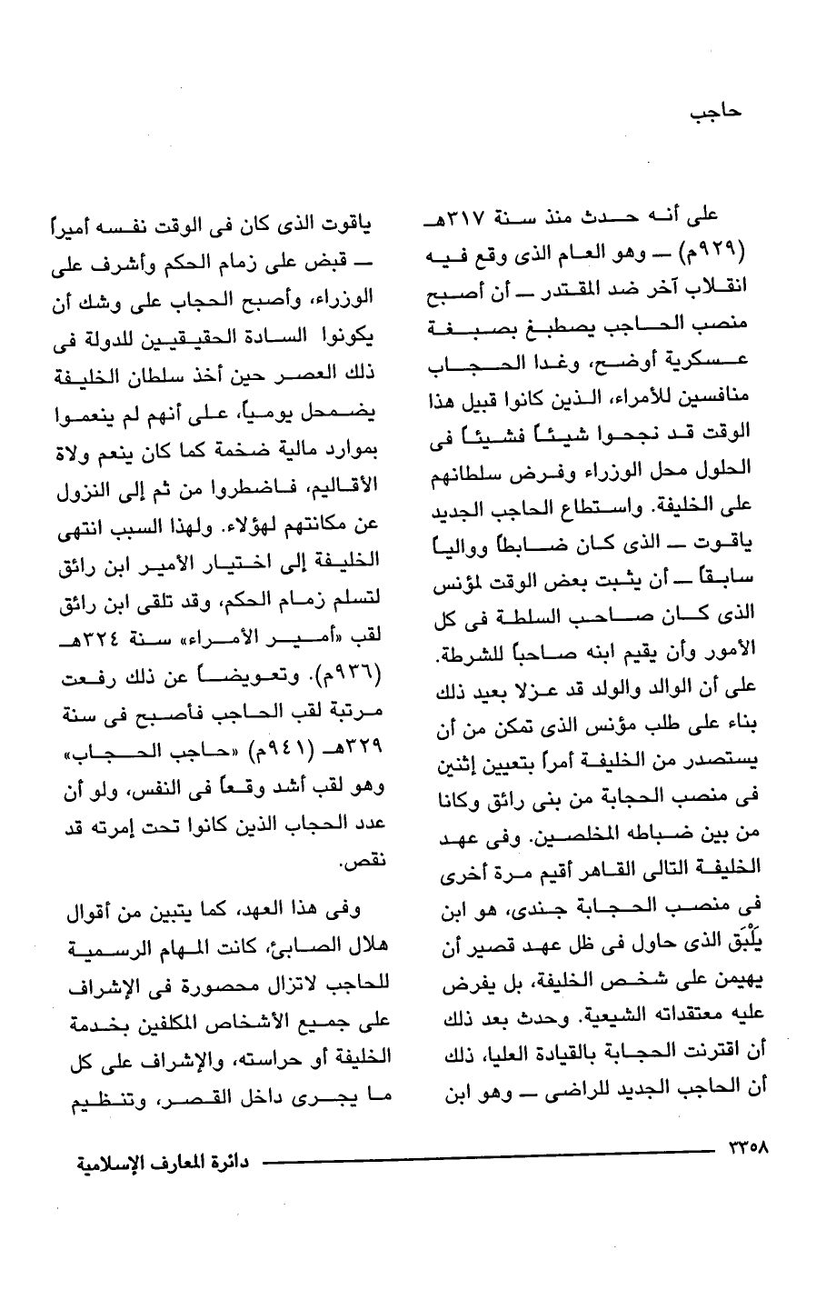 وفى هذا العهد، كما يتبين من أقوال هلال الصابئ، كانت المهام الرسمية للحاجب لا تزال محصورة فى الإشراف على جميع الأشخاص المكلفين بخدمة الخليفة أو حراسته، والإشراف على كل ما يجرى داخل القصر، وتنظيم