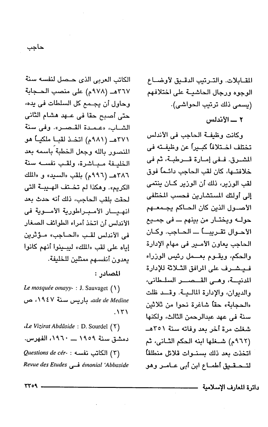 وكانت وظيفة الحاجب فى الأندلس تختلف اختلافًا كبيرًا، عن وظيفته فى المشرق. ففى إمارة قرطبة، ثم فى خلافتها، كان لقب الحاجب دائمًا فوق لقب الوزير، ذلك أن الوزير كان ينتمى إلى أولئك المستشارين فحسب المختلفى الأصول الذين كان الحاكم يجمعهم حوله ويختار من بينهم - فى جميع الأحوال تقريبًا - الحاجب. وكان الحاجب يعاون الأمير فى مهام الإدارة والحكم، ويقوم بعمل رئيس الوزراء فيشرف على المرافق الثلاثة للإدارة المدنية، وهى القصر السلطانى، والديوان، والإدارة المالية. وقد ظلت "الحجابة" حقًا شاغرة نحوا من ثلاثين سنة فى عهد عبد الرحمن الثالث، ولكنها شغلت مرة أخر بعد وفاته سنة 351 هـ (962 م) شغلها ابنه الحكم الثانى، ثم اتخذت بعد ذلك بسنوات قلائل منطلقًا لتحقيق أطماع ابن أبى عامر وهو الكاتب العربى الذى حصل لنفسه سنة 367 هـ (978 م) على منصب الحجابة وحاول أن يجمع كل السلطات فى يده، حتى أصبح حقا فى عهد هشام الثانى الشاب، "عمدة القصر". وفى سنة 371 هـ (981 م) اتخذ لقبا ملكيًا هو المنصور بالله وجعل الخطبة باسمه بعد الخليفة مباشرة، ولقب نفسه سنة 386 هـ (966 م) بلقب "السيد" و"الملك الكريم". وهكذا لم تختف الهيبة التى لحقت بلقب الحاجب، ذلك أنه حدث بعد انهيار الأمبراطورية الأموية فى الأندلس أن اتخذ أمراء الطوائف الصغار فى الأندلس لقب "الحاجب" مؤثرين إياه على لقب "الملك" ليبينوا أنهم كانوا يعدون أنفسهم ممثلين للخليفة.
