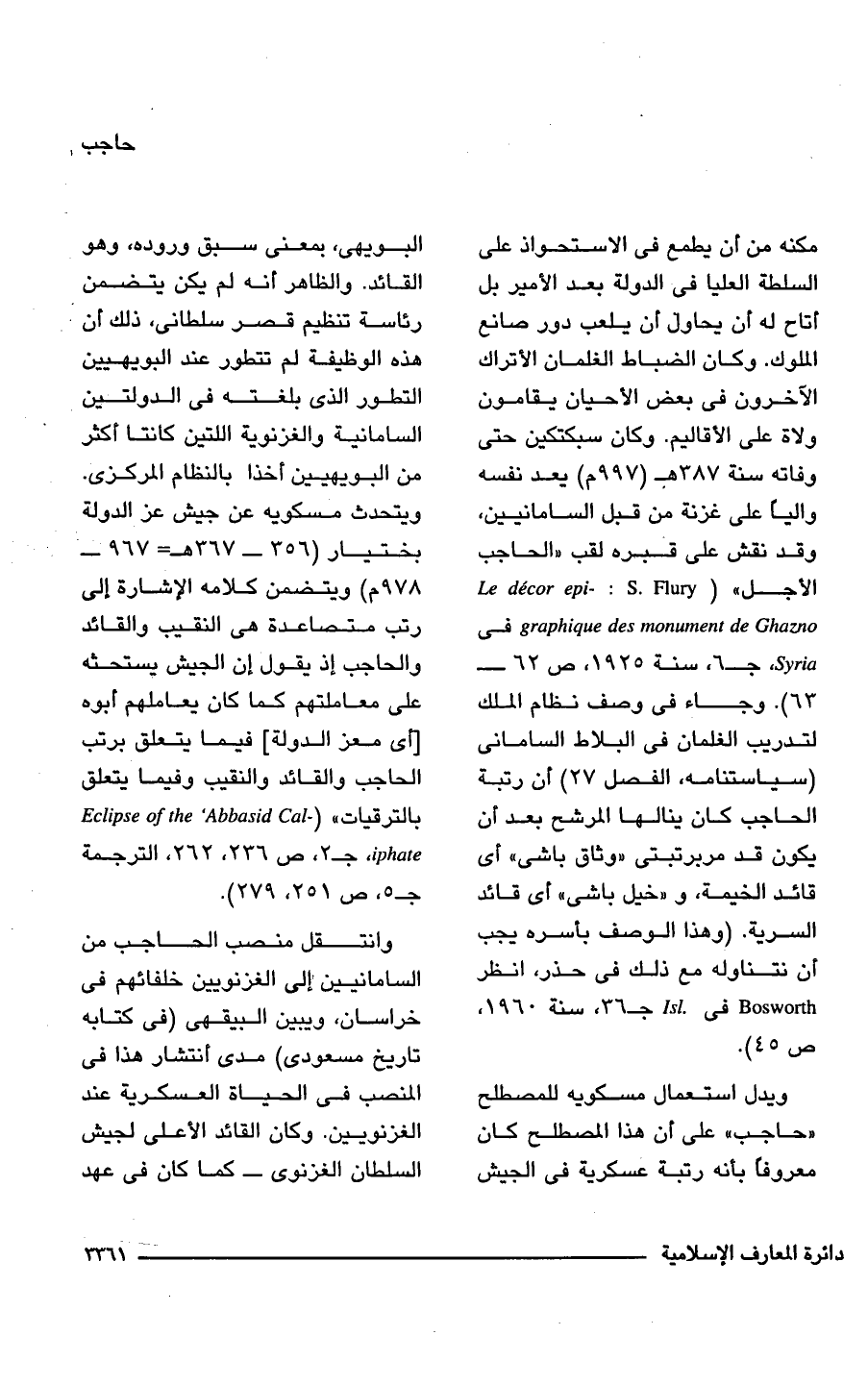 ويدل استعمال مسكويه للمصطلح "حاجب" على أن هذا المصطلح كان معروفًا بأنه رتبة عسكرية فى الجيش البويهى، بمعنى سبق وروده، وهو القائد. والظاهر أنه لم يكن يتضمن رئاسة تنظيم قصر سلطانى، ذلك أن هذه الوظيفة لم تتطور عند البويهيين التطور الذى بلغته فى الدولتين السامانية والغزنوية اللتين كانتا أكثر من البويهيين أخذا بالنظام المركزى. ويتحدث مسكويه عن جيش عز الدولة بختيار (356 - 367 هـ = 967 - 978 م) ويتضمن كلامه الإشارة إلى رتب متصاعدة هى النقيب والقائد والحاجب إذ يقول إن الجيش يستحثه على معاملتهم كما كان يعاملهم أبوه [أى معز الدولة] فيما يتعلق برتب الحاجب والقائد والنقيب وفيما يتعلق بالترقيات" (- Eclipse of the 'Abbasid Cal iphate, جـ 2، ص 236، 262، الترجمة جـ 5, ص 251, 279).