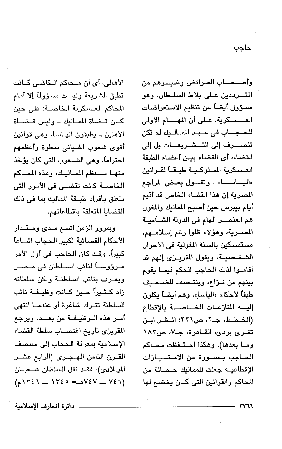 وأصحاب العرائض وغيرهم من المترددين على بلاط السلطان. وهو مسؤول أيضًا عن تنظيم الاستعراضات العسكرية. على أن المهام الأولى للحجاب فى عهد المماليك لم تكن تنصرف إلى التشريعات بل إلى القضاء، أى القضاء بين أعضاء الطبقة العسكرية المملوكية طبقًا لقوانين "الياسا". وتقول بعض المراجع المصرية إن هذا القضاء الخاص قد أقيم أيام بيبرس حين أصبح المماليك والمغول هم العنصر الهام فى الدولة الشآمية المصرية، وهؤلاء ظلوا رغم إسلامهم، مستمسكين بالسنة المغولية فى الأحوال الشخصية، ويقول المقريزى إنهم قد أقاموا لذلك الحاجب للحكم فيما يقوم بينهم من نزاع، وينتصف للضعيف طبقًا لأحكام "الياسا"، وهم أيضًا يكلون إليه المنازعات الخاصة بالإقطاع (الخطط، جـ 2، ص 221؛ انظر ابن تغرى بردى، القاهرة، جـ 7، ص 183 وما بعدها). وهكذا احتفظت محاكم الحاجب بصورة من الامتيازات الإقطاعية جعلت للمماليك حصانة من المحاكم والقوانين التى كان يخضع لها الأهالى، أى أن محاكم القاضى كانت تطبق الشريعة وليست مسؤولة إلا أمام المحاكم العسكرية الخاصة: على حين كان قضاة المماليك - وليس قضاة الأهلين - يطبقون الياسا، وهى قوانين أقوى شعوب الفيانى سطوة وأعظمهم احترامًا، وهى الشعوب التى كان يؤخذ منها معظم المماليك، وهذه المحاكم الخاصة كانت تقضى فى الأمور التى تتعلق بأفراد طبقة المماليك بما فى ذلك القضايا المتعلقة باقطاعاتهم.