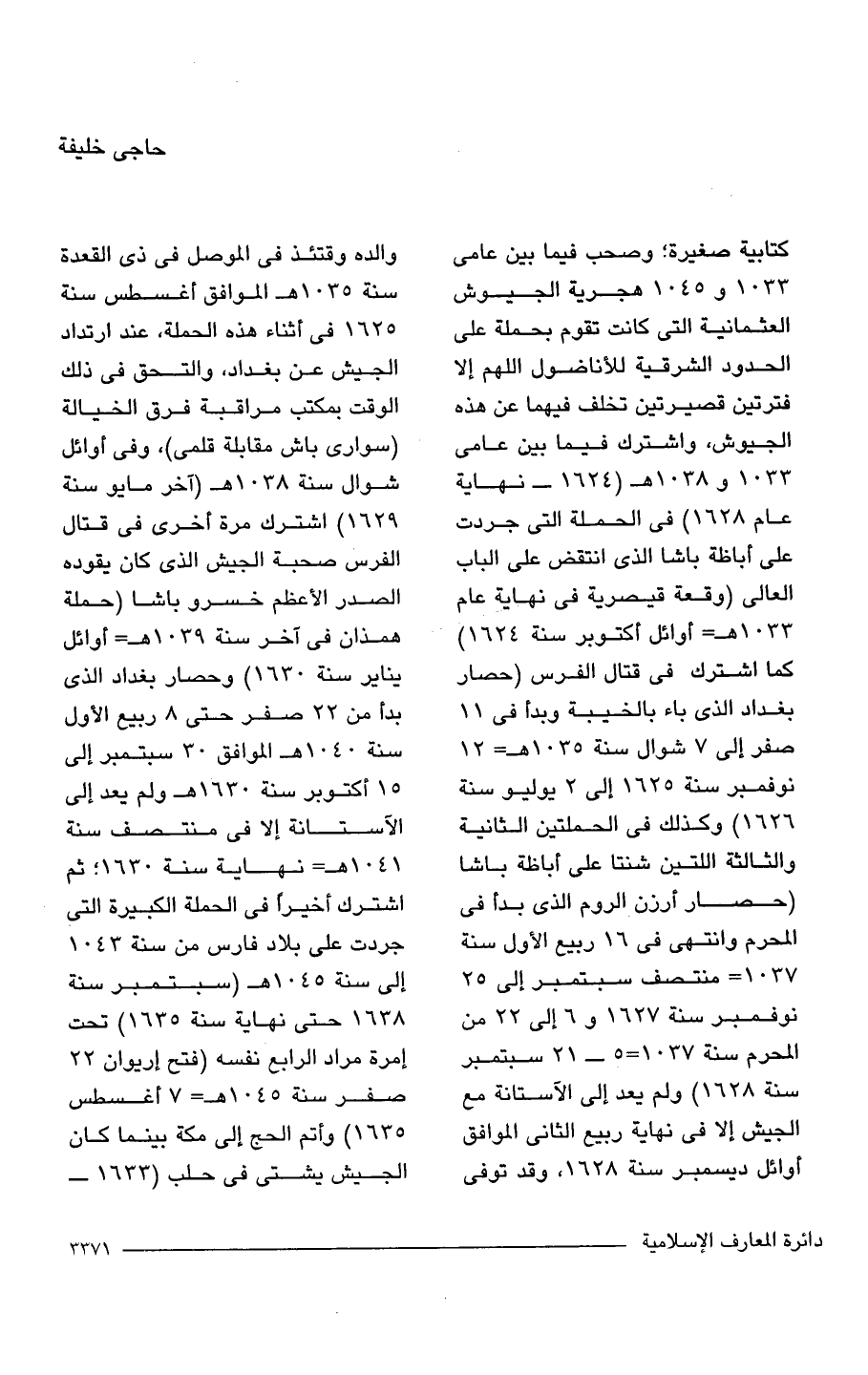 كتابية صغيرة؛ وصحب فيما بين عامى 1033 و 1045 هجرية الجيوش العثمانية التى كانت تقوم بحملة على الحدود الشرقية للأناضول اللهم إلا فترتين قصيرتين تخلف فيهما عن هذه الجيوش، واشترك فيما بين عامى 1033 و 1038 هـ (1624 - نهاية عام 1628) فى الحملة التى جردت على أباظة باشا الذى انتقض على الباب العالى (وقعة قيصرية فى نهاية عام 1033 هـ = أوائل أكتوبر سنة 1624) كما اشترك فى قتال الفرس (حصار بغداد الذى باء بالخيبة وبدأ فى 11 صفر إلى 7 شوال سنة 1035 هـ = 12 نوفمبر سنة 1625 إلى 2 يوليو سنة 1626) وكذلك فى الحملتين الثانية والثالثة اللتين شنتا على أباظة باشا (حصار أرزن الروم الذى بدأ فى المحرم وانتهى فى 16 ربيع الأول سنة 1037 = منتصف سبتمبر إلى 25 نوفمبر سنة 1627 و 6 إلى 22 من المحرم سنة 1037 = 5 - 21 سبتمبر سنة 1628) ولم يعد إلى الآستانة مع الجيش إلا فى نهاية ربيع الثانى الموافق أوائل ديسمبر سنة 1628, وقد توفى والده وقتئذ فى الموصل فى ذى القعدة سنة 1035 هـ الموافق أغسطس سنة 1625 فى أثناء هذه الحملة، عند ارتداد الجيش عن بغداد، والتحق فى ذلك الوقت بمكتب مراقبة فرق الخيالة (سوارى باش مقابلة قلمى)، وفى أوائل شوال سنة 1038 هـ (آخر مايو سنة 1629) اشترك مرة أخرى فى قتال الفرس صحبة الجيش الذى كان يقوده الصدر الأعظم خسرو باشا (حملة همذان فى آخر سنة 1039 هـ = أوائل يناير سنة 1630) وحصار بغداد الذى بدأ من 22 صفر حتى 8 ربيع الأول سنة 1040 هـ الموافق 30 سبتمبر إلى 15 أكتوبر سنة 1630 هـ لم يعد إلى الآستانة إلا فى منتصف سنة 1041 هـ = نهاية سنة 1630؛ ثم اشترك أخيرًا فى الحملة الكبيرة التي جردت على بلاد فارس من سنة 1043 إلى سنة 1045 هـ (سبتمبر سنة 1638 حتى نهاية سنة 1635) تحت إمرة مراد الرابع نفسه (فتح إريوان 22 صفر سنة 1045 هـ = 7 أغسطس 1635) وأتم الحج إلى مكة بينما كان الجيش يشتى فى حلب (1633 -