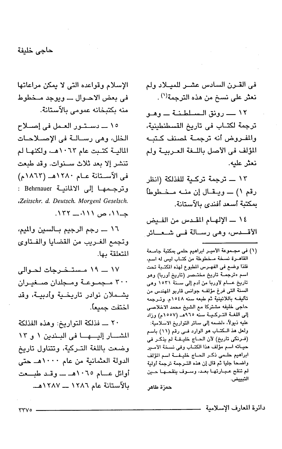 (¬1) فى مجموعة الأمير ابراهيم حلمى بمكتبة جامعة القاهرة نسخة مخطوطة من كتاب ليس له اسم، فلذا وضع فى الفهرس المطبوع لهذه المكتبة تحت اسم "ترجمة تاريخ مختصر (تاريخ أوربا) وهو تاريخ عام لأوربا من آدم إلى سنة 1531 وهى السنة التى فرغ مؤلفه جوانس قاربو المهندس من تأليفه باللاتينية ثم طبعه سنه 1548 م. وترجمه حاجى خليفه مشتركا مع الشيخ محمد الاخلاصى إلى اللغة التركية سنه 965 هـ (1557 م) وزاد عليه ذيولًا، "لضمه إلى سائر التواريخ الإسلامية: ولعل هذ الكتاب هو الوارد فى رقم (11) باسم (فرنكى تاريخ) لأن الحاج خليفة لم يذكر فى حياته اسم مؤلف هذا الكتاب وفى نسخة الأمير إبراهيم حلمى ذكر الحاج خليفة اسم المؤلف واضحا جليا ثم قال إن هذه الترجمة ترجمة أولية لم تنقح عبارتها بعد، وسوف ينقحها حين التبييض.