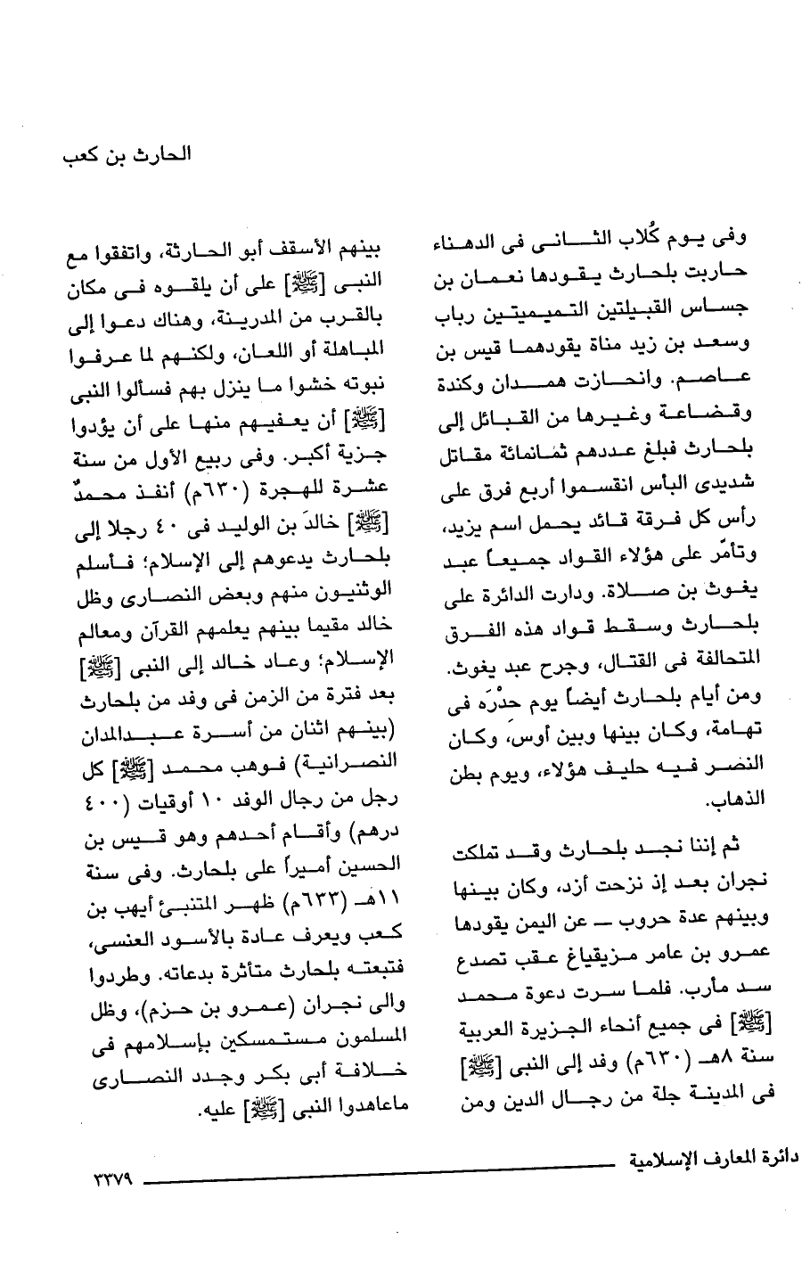 ثم إننا نجد بلحارث وقد تملكت نجران بعد إذ نزحت أزد، وكان بينها وبينهم عدة حروب - عن اليمن يقودها عمرو بن عامر مزيقياغ عقب تصدع سد مأرب. فلما سرت دعوة محمد [- صلى الله عليه وسلم -] فى جميع أنحاء الجزيرة العربية سنة 8 هـ (630 م) وفد إلى النبى [- صلى الله عليه وسلم -] فى المدينة جلة من رجال الدين ومن بينهم الأسقف أبو الحارثة، واتفقوا مع النبى [- صلى الله عليه وسلم -] على أن يلقوه فى مكان بالقرب من المدينة، وهناك دعوا إلى المباهلة أو اللعان، ولكنهم لما عرفوا نبوته خشوا ما ينزل بهم فسألوا النبى [- صلى الله عليه وسلم -] أن يعفيهم منها على أن يؤدوا جزية أكبر. وفى ربيع الأول من سنة عشرة للهجرة (630 م) أنفذ محمدٌ [- صلى الله عليه وسلم -] خالدَ بن الوليد فى 40 رجلا إلى بلحارث يدعوهم إلى الإسلام؛ فأسلم الوثنيون منهم وبعض النصارى وظل خالد مقيما بينهم يعلمهم القرآن ومعالم الإسلام؛ وعاد خالد إلى النبى [- صلى الله عليه وسلم -] بعد فترة من الزمن فى وفد من بلحارث (بينهم اثنان من أسرة عبد المدان النصرانية) فوهب محمد [- صلى الله عليه وسلم -] كل رجل من رجال الوفد 10 أوقيات (400 درهم) وأقام أحدهم وهو قيس بن الحسين أميرًا على بلحارث. وفى سنة 11 هـ (633 م) ظهر المتنبئ أيهب بن كعب ويعرف عادة بالأسود العنسى، فتبعته بلحارث متأثرة بدعاته. وطردوا والى نجران (عمرو بن حزم)، وظل المسلمون مستمسكين بإسلامهم فى خلافة أبى بكر وجدد النصارى ما عاهدوا النبى [- صلى الله عليه وسلم -] عليه.