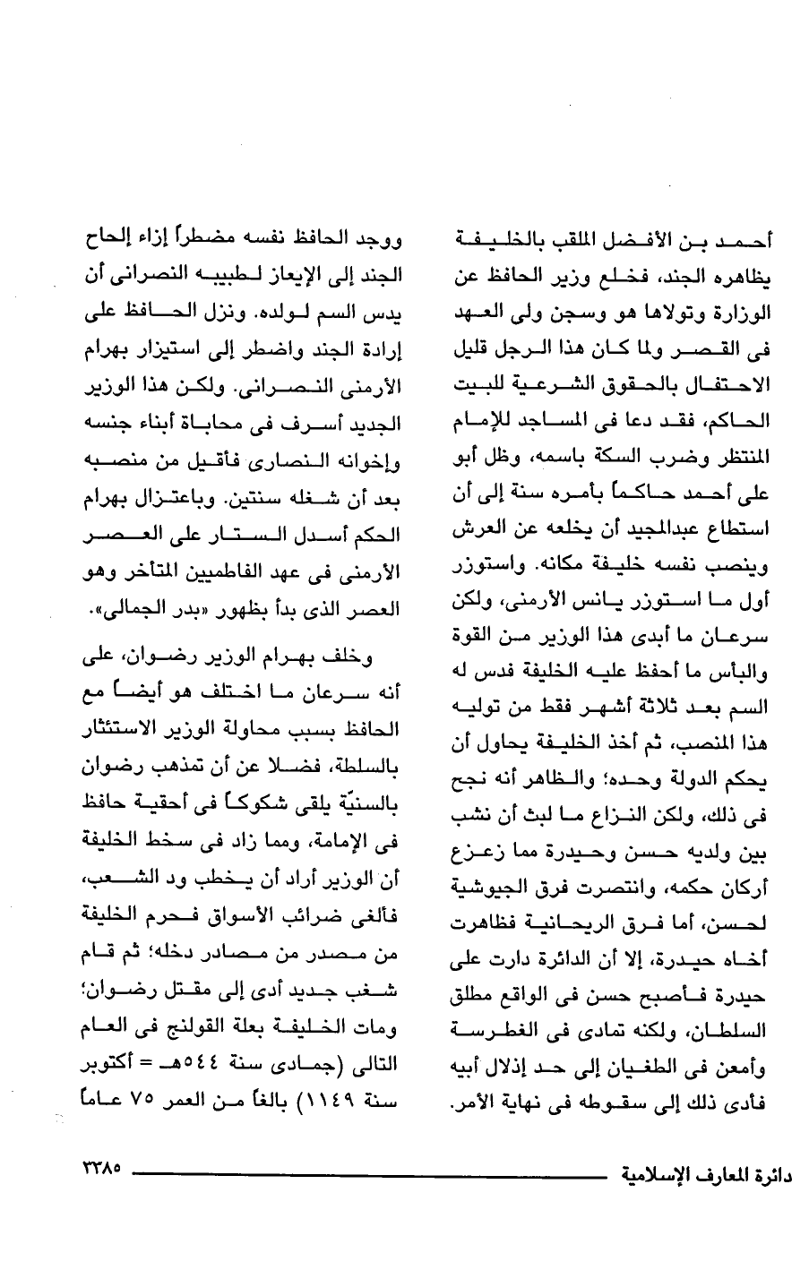 أحمد بن الأفضل الملقب بالخليفة يظاهره الجند، فخلع وزير الحافظ عن الوزارة وتولاها هو وسجن ولى العهد فى القصر ولما كان هذا الرجل قليل الاحتفال بالحقوق الشرعية للبيت الحاكم، فقد دعا فى المساجد للإمام المنتظر وضرب السكة باسمه، وظل أبو على أحمد حاكمًا بأمره سنة إلى أن استطاع عبد المجيد أن يخلعه عن العرش وينصب نفسه خليفة مكانه. واستوزر أول ما استوزر يانس الأرمنى، ولكن سرعان ما أبدى هذا الوزير من القوة والبأس ما أحفظ عليه الخليفة فدس له السم بعد ثلاثة أشهر فقط من توليه هذا المنصب، ثم أخذ الخليفة يحاول أن يحكم الدولة وحده؛ والظاهر أنه نجح فى ذلك، ولكن النزاع ما لبث أن نشب بين ولديه حسن وحيدرة مما زعزع أركان حكمه، وانتصرت فرق الجيوشية لحسن، أما فرق الريحانية فظاهرت أخاه حيدرة، إلا أن الدائرة دارت على حيدرة فأصبح حسن فى الواقع مطلق السلطان، ولكنه تمادى فى الغطرسة وأمعن فى الطغيان إلى حد إذلال أبيه فأدى ذلك إلى سقوطه فى نهاية الأمر. ووجد الحافظ نفسه مضطرًا إزاء إلحاح الجند إلى الإيعاز لطبيبه النصرانى أن يدس السم لولده. ونزل الحافظ على إرادة الجند واضطر إلى استيزار بهرام الأرمنى النصرانى. ولكن هذا الوزير الجديد أسرف فى محاباة أبناء جنسه وإخوانه النصارى فأقيل من منصبه بعد أن شغله سنتين. وباعتزال بهرام الحكم أسدل الستار على العصر الأرمنى فى عهد الفاطميين المتأخر وهو العصر الذى بدأ بظهور "بدر الجمالى".