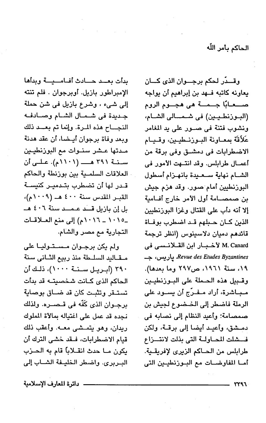 وقدّر لحكم برجوان الذى كان يعاونه كاتبه فهد بن إبراهيم أن يواجه صعابًا جمة هى هجوم الروم (البوزنطيين) فى شمالى الشام، ونشوب فتنة فى صور على يد المغامر عَلّاقَة بمعاونة البوزنطيين، وقيام الاضطرابات فى دمشق وفى برقة من أعمال طرابلس. وقد انتهت الأمور فى الشام نهاية سعيدة بانهزام أسطول البوزنطيين أمام صور. وقد هزم جيش بن صمصامة أول الأمر خارج أفامية إلا أنَّه دأب على القتال وغزا البوزنطيين الذين كان حبلهم قد اضطرب بوفاة قائدهم دميان دلاسينوس (انظر ترجمة M. Canard لأخبار ابن القلانسى فى Revue des Etudes Byzantines, باريس، جـ 19، سنة 1961، ص 297 وما بعدها). وقبيل هذه الحملة على البوزنطيين مباشرة، أراد مفرّج أن يسود على الرملة فاضطر إلى الخضوع لجيش بن صمصامة؛ وأعيد النظام إلى نصابه فى دمشق، وأعيد أيضًا إلى برقة، ولكن فشلت المحاولة التى بذلت لانتزاع طرابلس من الحاكم الزيرى لإفريقية. أما المفاوضات مع البوزنطيين التى بدأت بعد حادث أفامية وبدأها الإمبراطور بازيل. أوبرجوان. فلم تنته إلى شئ، وشرع بازيل فى شن حملة جديدة فى شمال الشام وصادفه النجاح هذه المرة. وإنما تم بعد ذلك وبعد وفاة برجوان أيضا، أن عقد هدنة مدتها عشر سنوات مع البوزنطيين سنة 391 هـ (1101 م). على أن العلاقات السلمية بين بوزنطة والحاكم قدر لها أن تضطرب بتدمير كنيسة القبر المقدس سنة 400 هـ (1009 م)، بل إن بازيل قد عمد سنة 406 هـ - 1015 - 1016 م) إلى منع العلاقات التجارية مع مصر والشام.