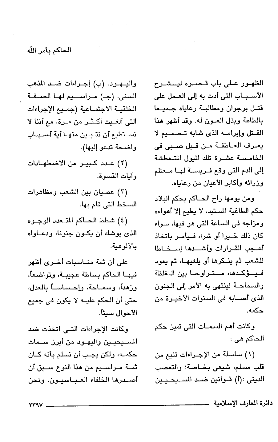 (1) سلسلة من الإجراءات تنبع من قلب مسلم، شيعى بخاصة؛ والتعصب الدينى: (أ) قوانين ضد المسيحيين واليهود. (ب) إجراءات ضد المذهب السنى. (جـ) مراسيم لها الصفة الخلقية الاجتماعية (جميع الإجراءات التى ألغيت أكثر من مرة، مع أننا لا نستطيع أن نتبين منها أية أسباب واضحة تدعو إليها).