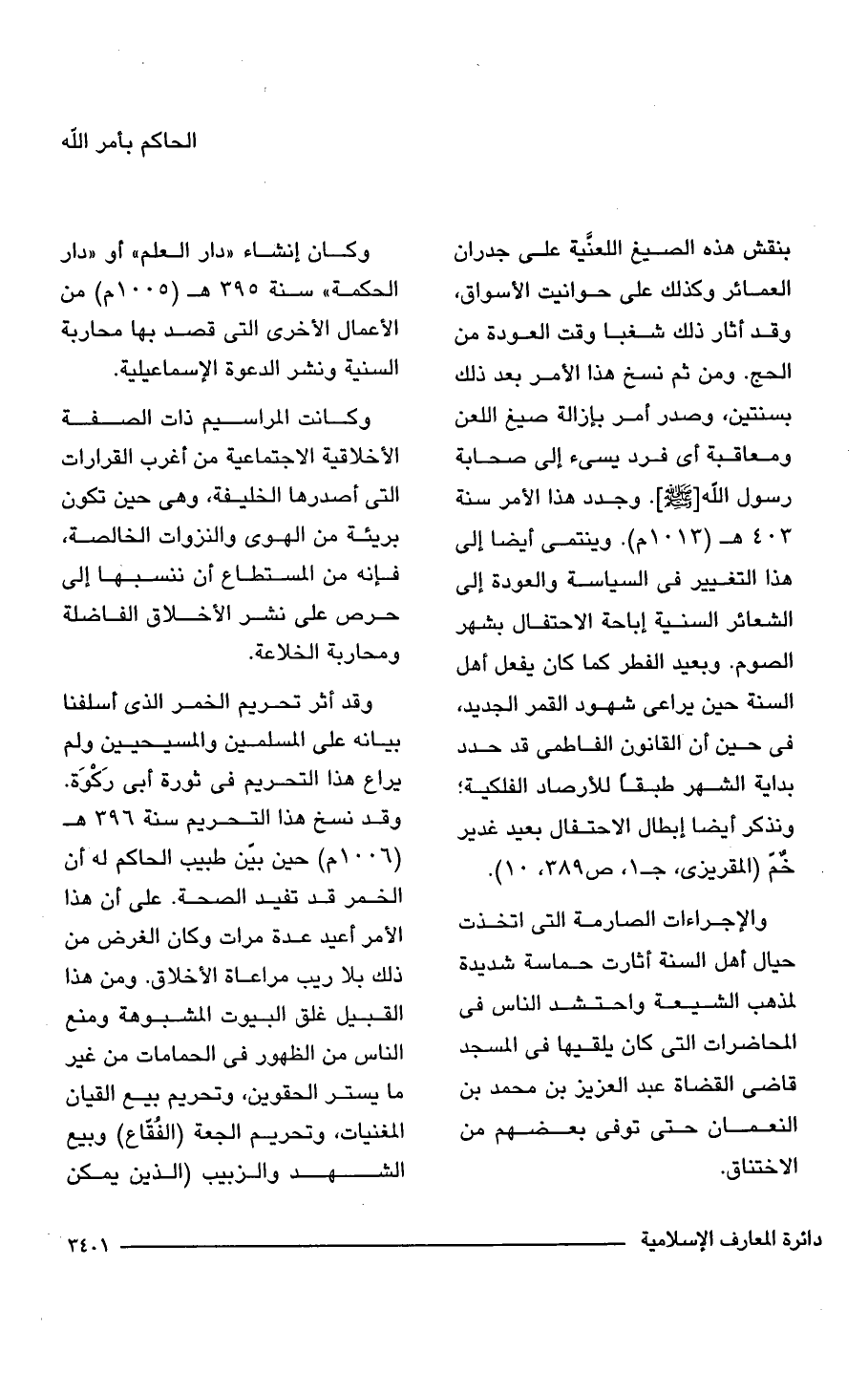 بنقش هذه الصيغ اللعنَّية على جدران العمائر وكذلك على حوانيت الأسواق، وقد أثار ذلك شغبا وقت العودة من الحج. ومن ثمَّ نسخ هذا الأمر بعد ذلك بسنتين، وصدر أمر بإزالة صيغ اللعن ومعاقبة أى فرد يسئ إلى صحابة رسول الله [- صلى الله عليه وسلم -]. وجدد هذا الأمر سنة 403 هـ (1013 م). وينتمى أيضا إلى هذا التغيير فى السياسة والعودة إلى الشعائر السنية إباحة الاحتفال بشهر الصوم. وبعيد الفطر كما كان يفعل أهل السنة حين يراعى شهود القمر الجديد، فى حين أن القانون الفاطمى قد حدد بداية الشهر طبقًا للأرصاد الفلكية؛ ونذكر أيضا إبطال الاحتفال بعيد غدير خم (المقريزى، جـ 1، ص 389، 10).