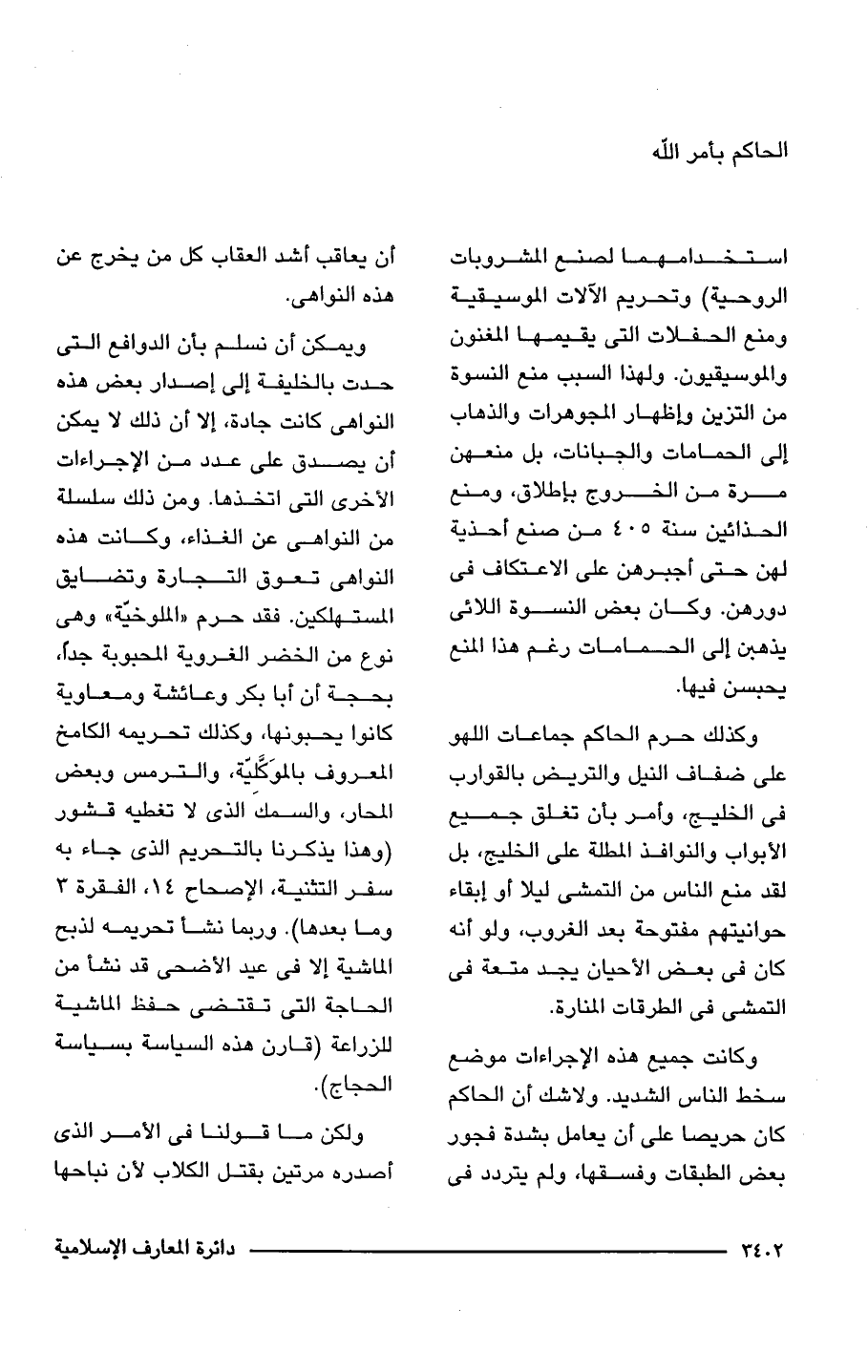 استخدامهما لصنع المشروبات الروحية) وتحريم الآلات الموسيقية ومنع الحفلات التى يقيمها المغنون والموسيقيون. ولهذا السبب منع النسوة من التزين وإظهار المجوهرات والذهاب إلى الحمامات والجبانات، بل منعهن مرة من الخروج بإطلاق، ومنع الحذائين سنة 405 من صنع أحذية لهن حتى أجبرهن على الاعتكاف فى دورهن. وكان بعض النسوة اللائى يذهبن إلى الحمامات رغم هذا المنع يحبسن فيها.