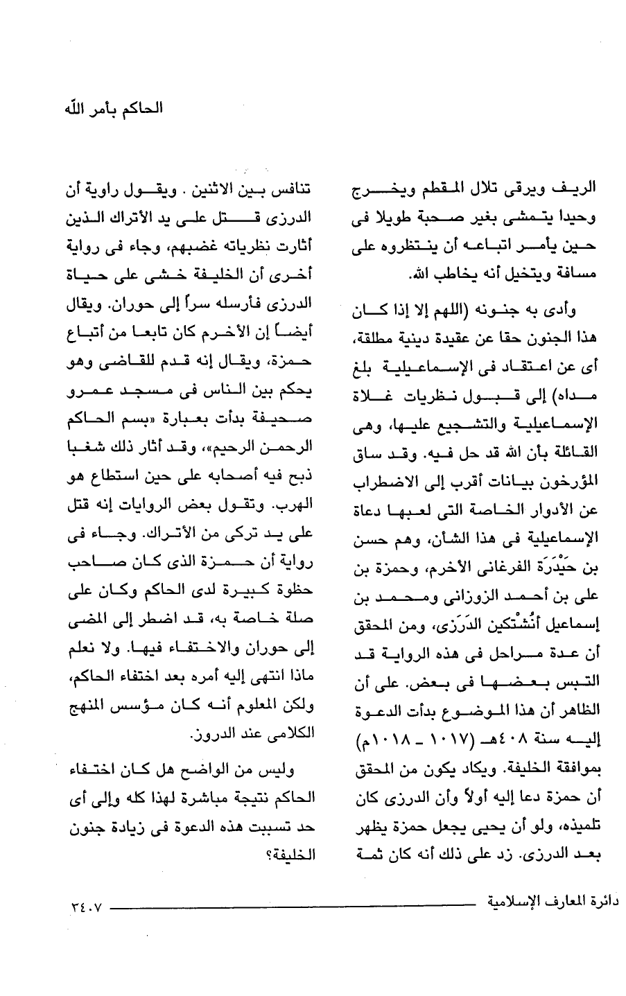 وأدى به جنونه (اللهم إلا إذا كان هذا الجنون حقا عن عقيدة دينية مطلقة، أى عن اعتقاد فى الإسماعيلية بلغ مداه) إلى قبول نظريات غلاة الإسماعيلية والتشجيع عليها، وهى القائلة بأن الله قد حل فيه. وقد ساق المؤرخون بيانات أقرب إلى الاضطراب عن الأدوار الخاصة التى لعبها دعاة الإسماعيلية في هذا الشأن، وهم حسن بن حَيْدَرَة الفرغانى الأخرم، وحمزة بن على بن أحمد الزوزانى ومحمد بن إسماعيل أنُشْتكين الدَرَزى، ومن المحقق أن عدة مراحل فى هذه الرواية قد التبس بعضها فى بعض. على أن الظاهر أن هذا الموضوع بدأت الدعوة إليه سنة 408 هـ (1017 - 1018 م) بموافقة الخليفة. ويكاد يكون من المحقق أن حمزة دعا إليه أولًا وأن الدرزى كان تلميذه، ولو أن يحيى يجعل حمزة يظهر بعد الدرزى. زد على ذلك أنَّه كان ثمة تنافس بين الاثنين. ويقول راوية أن الدرزى قتل على يد الأتراك الذين أثارت نظرياته غضبهم، وجاء فى رواية أخرى أن الخليفة خشى على حياة الدرزى فأرسله سرًا إلى حوران. ويقال أيضًا إن الأخرم كان تابعا من أتباع حمزة، ويقال إنه قدم للقاضى وهو يحكم بين الناس فى مسجد عمرو صحيفة بدأت بعبارة "بسم الحاكم الرحمن الرحيم"، وقد أثار ذلك شغبا ذبح فيه أصحابه على حين استطاع هو الهرب. وتقول بعض الروايات إنه قتل على يد تركى من الأتراك. وجاء فى رواية أن حمزة الذى كان صاحب حظوة كبيرة لدى الحاكم وكان على صلة خاصة به، قد اضطر إلى المضى إلى حوران والاختفاء فيها. ولا نعلم ماذا انتهى إليه أمره بعد اختفاء الحاكم، ولكن المعلوم أنَّه كان مؤسس المنهج الكلامى عند الدروز.