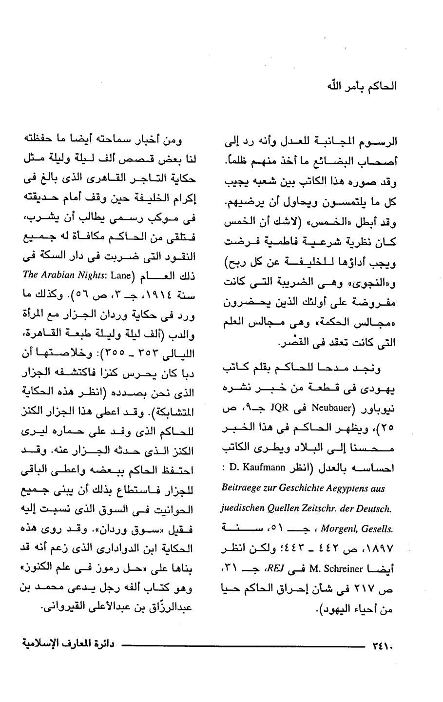 ونجد مدحا للحاكم بقلم كاتب يهودى فى قطعة من خبر نشره نيوباور (Neubauer فى JQR جـ 9، ص 25)، ويظهر الحاكم فى هذا الخبر محسنا إلى البلاد ويطرى الكاتب احساسه بالعدل (انظر D. Kaufmann: Beitraege zur Geschichte Aegyptens aus .juedischen Quellen Zeitschr. der Deutsch . Morgenl Gesells. ., جـ 51، سنة 1897، ص 442 - 443؛ ولكن انظر أيضًا M. Schreiner فى REJ، جـ 31، ص 217 فى شأن إحراق الحاكم حيا من أحياء اليهود).