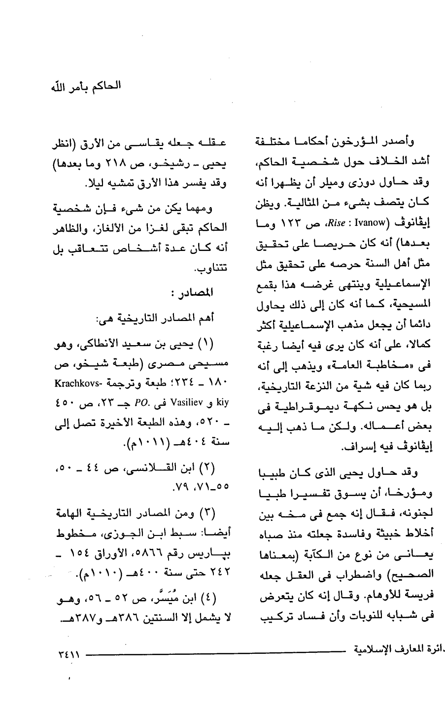 (1) يحيى بن سعيد الأنطاكى، وهو مسيحى مصرى (طبعة شيخو، ص 180 - 234؛ طبعة وترجمة - Krachkovs kiy و Vasiliev فى. po جـ 23، ص 450 - 520، وهذه الطبعة الأخيرة تصل إلى سنة 404 هـ (1011 م).