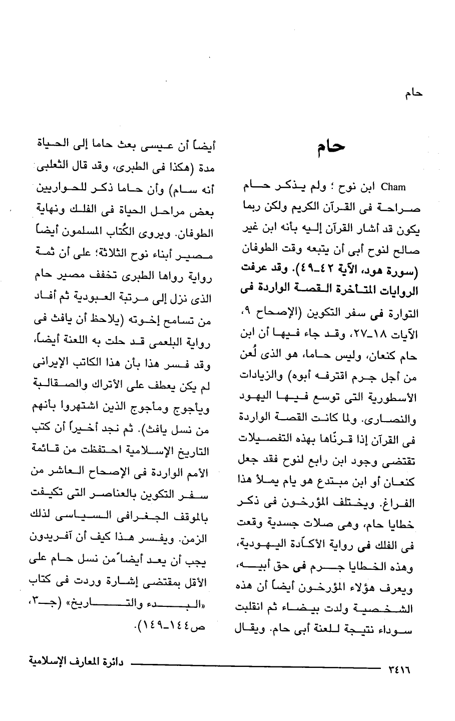 Cham ابن نوح؛ ولم يذكر حام صراحة فى القرآن الكريم ولكن ربما يكون قد أشار القرآن إليه بأنه ابن غير صالح لنوح أبى أن يتبعه وقت الطوفان (سورة هود، الآية 42 - 49). وقد عرفت الروايات المتأخرة القصة الواردة فى التوراة فى سفر التكوين (الإصحاح 9، الآيات 18 - 27، وقد جاء فيها أن ابن حام كنعان، وليس حاما، هو الذى لُعن من أجل جرم اقترفه أبوه) والزيادات الأسطورية التى توسع فيها اليهود والنصارى. ولما كانت القصة الواردة فى القرآن إذا قرنّاها بهذه التفصيلات تقتضى وجود ابن رابع لنوح فقد جعل كنعان أو ابن مبتدع هو يام يملأ هذا الفراغ. ويختلف المؤرخون فى ذكر خطايا حام، وهى صلات جسدية وقعت فى الفلك فى رواية الأكادة اليهودية، وهذه الخطايا جرم فى حق أبيه، ويعرف هؤلاء المؤرخون أيضًا أن هذه الشخصية ولدت بيضاء ثمَّ انقلبت سوداء نتيجة للعنة أبى حام. ويقال أيضًا أن عيسى بعث حاما إلى الحياة مدة (هكذا فى الطبرى، وقد قال الثعلبى أنه سام) وأن حاما ذكر للحواريين بعض مراحل الحياة فى الفلك ونهاية الطوفان. ويروى الكُتاب المسلمون أيضًا مصير أبناء نوح الثلاثة؛ على أن ثمة رواية رواها الطبرى تخفف مصير حام الذى نزل إلى مرتبة العبودية ثمَّ أفاد من تسامح إخوته (يلاحظ أن يافث فى رواية البلعمى قد حلت به اللعنة أيضًا، وقد فسر هذا بأن هذا الكاتب الإيرانى لم يكن يعطف على الأتراك والصقالبة ويأجوج ومأجوج الذين اشتهروا بأنهم من نسل يافث). ثمَّ نجد أخيرًا أن كتب التاريخ الإِسلامية احتفظت من قائمة الأمم الواردة فى الإصحاح العاشر من سفر التكوين بالعناصر التى تكيفت بالموقف الجغرافى السياسى لذلك الزمن. ويفسر هذا كيف أن آفريدون يجب أن يعد أيضًا من نسل حام على الأقل بمقتضى إشارة وردت فى كتاب "البدء والتاريخ" (جـ 3، ص 144 - 149).