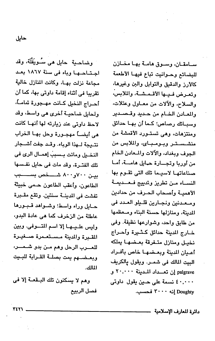وضاحية حايل هى سُويَفْلَة، وقد اجتاحها وباء فى سنة 1867 بعد مجاعة نزلت بها، وكانت المنازل خالية تقريبا فى أثناء إقامة داوتى بها، كما أن أحراج النخيل كانت مهجورة تمامًا، ولحايل ضاحية أخرى هى واسط، وقد لاحظ داوتى عند زيارته لها أنها كانت هى أيضًا مهجورة وحل بها الخراب نتيجة لهذا الوباء. وقد جفت أشجار النخيل وماتت بسبب إهمال الرى فى تلك الفترة، وقد مات فى حايل نفسها بين 700 و 800 شخص بسبب الطاعون، وأعقب الطاعون حمى خبيثة تفشت فى المدينة سنتين. وتقع مقبرة حايل وراء واسط؛ وشواهد قبورها عاطلة من الزخرف كما هى عادة البدو، وليس عليها إلا اسم المتوفى. وبين المقبرة والمدينة مستعمرة صغيرة للعرب الرحل وهم من بدو شمر، وبعضهم يمت بصلة القرابة للبيت المالك.