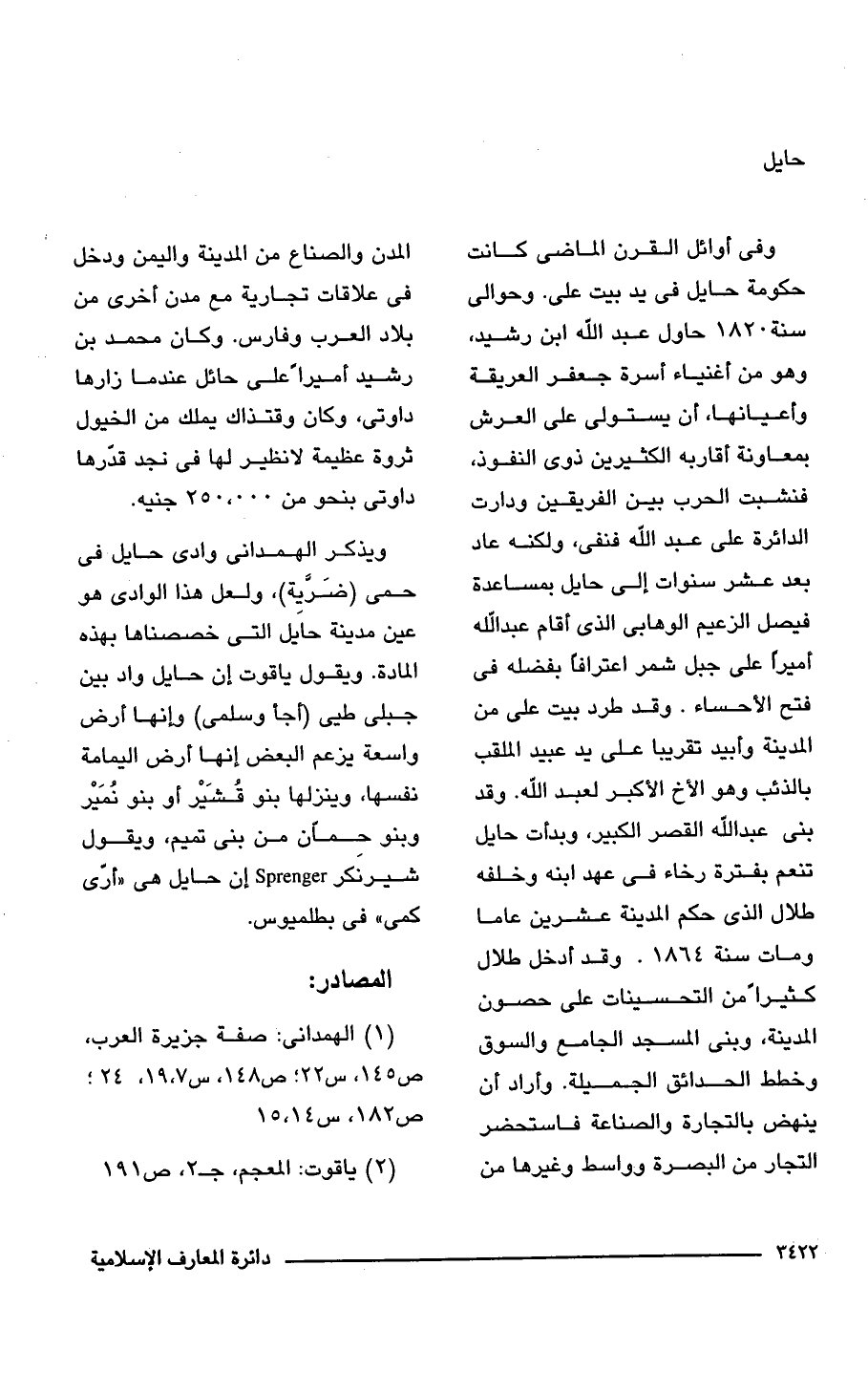 ويذكر الهمدانى وادى حايل فى حمى (ضَرَّيِة)، ولعل هذا الوادى هو عين مدينة حايل التى خصصناها بهذه المادة. ويقول ياقوت إن حايل واد بين جبلى طيى (أجأ وسلمى) وإنها أرض واسعة يزعم البعض إنها أرض اليمامة نفسها، وينزلها بنو قُشَيْر أو بنو نُمَيْر وبنو حِمان من بنى تميم، ويقول شيرنكر Sprenger إن حايل هى "أرّى كمى" فى بطلميوس.