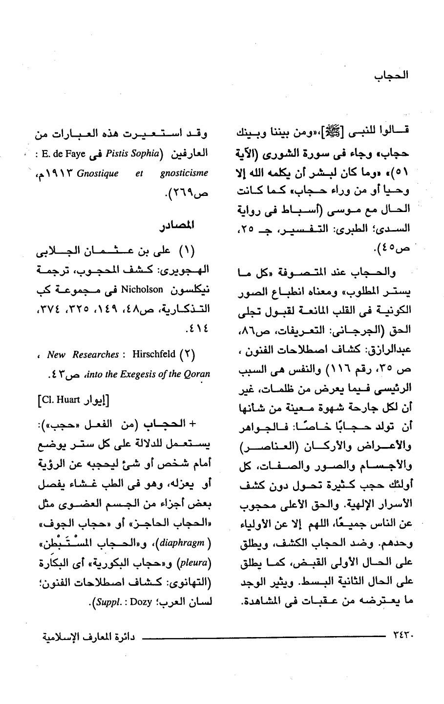 والحجاب عند المتصوفة "كل ما يستر المطلوب" ومعناه انطباع الصور الكونية فى القلب المانعة لقبول تجلى الحق (الجرجانى: التعريفات، ص 86، عبد الرازق: كشاف اصطلاحات الفنون، ص 35، رقم 116) والنفس هى السبب الرئيسى فيما يعرض من ظلمات، غير أن لكل جارحة شهوة معينة من شأنها أن تولد حجابًا خاصًا: فالجواهر والأعراض والأركان (العناصر) والأجسام والصور والصفات، كل أولئك حجب كثيرة تحول دون كشف الأسرار الإلهية. والحق الأعلى محجوب عن الناس جميعًا، اللهم إلا عن الأولياء وحدهم. وضد الحجاب الكشف، ويطلق على الحال الأولى القبض، كما يطلق على الحال الثانية البسط. ويثير الوجد ما يعترضه من عقبات فى المشاهدة. وقد استعيرت هذه العبارات من العارفين (Pistis Sophia فى E. de Faye: Gnostique et gnosticisme 1913 م، ص 269).