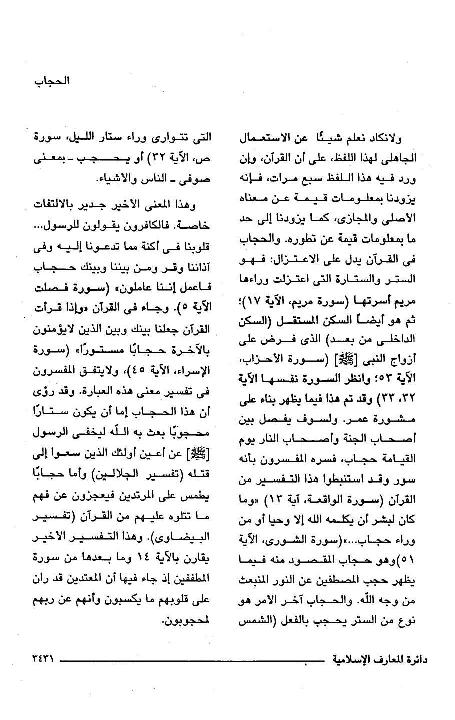ولا نكاد نعلم شيئًا عن الاستعمال الجاهلى لهذا اللفظ، على أن القرآن، وإن ورد فيه هذا اللفظ سبع مرات، فإنَّه يزودنا بمعلومات قيمة عن معناه الأصلى والمجازى، كما يزودنا إلى حد ما بمعلومات قيمة عن تطوره. والحجاب فى القرآن يدل على الاعتزال: فهو الستر والستارة التى اعتزلت وراءها مريم أسرتها (سورة مريم، الآية 17)؛ ثمَّ هو أيضًا السكن المستقل (السكن الداخلى من بعد) الذى فرض على أزواج النبى [- صلى الله عليه وسلم -] (سورة الأحزاب، الآية 53؛ وانظر السورة نفسها الآية 32، 33) وقد تم هذا فيما يظهر بناء على مشورة عمر. ولسوف يفصل بين أصحاب الجنة وأصحاب النار يوم القيامة حجاب، فسره المفسرون بأنه سور وقد استنبطوا هذا التفسير من القرآن (سورة الواقعة، آية 13) "وما كان لبشر أن يكلمه الله إلا وحيا أو من وراء حجاب ... " (سورة الشورى، الآية 51) وهو حجاب المقصود منه فيما يظهر حجب المصطفين عن النور المنبعث من وجه الله. والحجاب آخر الأمر هو نوع من الستر يحجب بالفعل (الشمس التى تتوارى وراء ستار الليل، سورة ص، الآية 32) أو يحجب - بمعنى صوفى - الناس والأشياء.