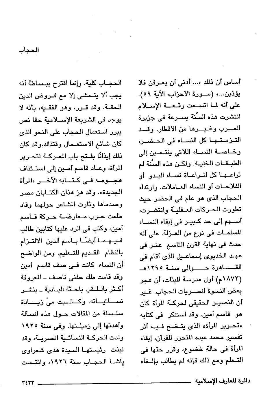 أساس أن ذلك " ... أدنى أن يعرفن فلا يؤذين ... " (سورة الأحزاب، الآية 59). على أنَّه لما اتسعت رقعة الإِسلام انتشرت هذه السُنة بسرعة فى جزيرة العرب وغيرها من الأقطار. وقد التزمتها كل النساء فى الحضر، وخاصة النساء اللائى ينتمين إلى الطبقات الخلية. ولكن هذه السُنة لم تراعها كل المراعاة نساء البدو أو الفلاحات أو النساء العاملات. وارتداء الحجاب الذى هو عام فى الحضر حيث تطورت الحركات العقلية وانتشرت، أسهم إلى حد كبير فى إبقاء النساء المسلمات فى نوع من العزلة. على أنَّه حدث فى نهاية القرن التاسع عشر فى عهد الخديوى إسماعيل الذى أقام فى القاهرة حوالى سنة 1295 هـ (1873 م) أول مدرسة للبنات، أن هجر بعض النسوة المصريات الحجاب. غير أن النصير الحقيقى لحركة المرأة كان هو قاسم أمين. وقد استنكر فى كتابه "تحرير المرأة" الذى يتضح فيه أثر تفسير محمَّد عبده المتحرر للقرآن، إبقاء المرأة فى حالة خضوع، وقرر حقها فى التعلم ومع ذلك فإنَّه لم يطالب بإلغاء الحجاب كلية، وإنما اقترح ببساطة أنَّه يجب ألا يتمشى إلا مع فروض الدين الحقة. وقد قرر، وهو الفقيه، بأنه لا يوجد فى الشريعة الإِسلامية حقا نص يبرر استعمال الحجاب على النحو الذى كان شائع الاستعمال وقتذاك. وقد كان ذلك إيذانًا بفتح باب المعركة لتحرير المرأة، وعاد قاسم أمين إلى استئناف هجومه فى كتابه الآخر "المرأة الجديدة". وقد هز هذان الكتابان مصر وصدماها وثارت المشاعر حولهما وقاد طلعت حرب معارضة حركة قاسم أمين، وكتب فى الرد عليها كتابين طالب فيهما أيضًا باسم الدين الالتزام بالنظام القديم للتعليم. ومن الواضح أن النساء كانت فى صف قاسم أمين وقد قامت ملك حفنى ناصف - المعروفة أكثر باللقب باحثة البادية - بنشر نسائياته، وكتبت مى زيادة سلسلة من المقالات حول هذه المسألة وأهدتها إلى زميلتها. وفى سنة 1925 ولدت الحركة النسائية المصرية، وقد نبذت رئيستها السيدة هدى شعراوى باشا الحجاب سنة 1926، وائتست