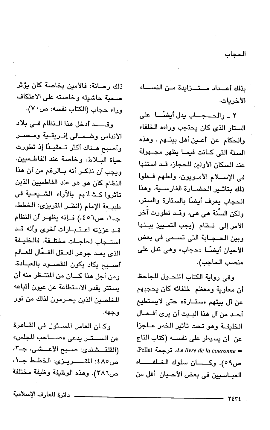 2 - والحجاب يدل أيضًا على الستار الذى كان يحتجب وراءه الخلفاء والحكام عن أعين أهل بيتهم. وهذه السنة التى كانت فيما يظهر مجهولة عند السكان الأولين للحجاز، قد استنها فى الإِسلام الأمويون، ولعلهم فعلوا ذلك بتأثير الحضارة الفارسية. وهذا الحجاب يعرف أيضًا بالستارة والستر، ولكن السُنة هى هى، وقد تطورت آخر الأمر إلى نظام (يجب التمييز بينها وبين الحجابة التى تسمى فى بعض الأحيان أيضًا "حجاب" وهى تدل على منصب الحاجب).