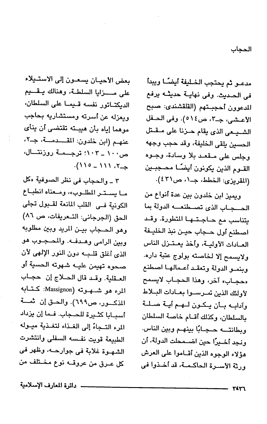 ويميز ابن خلدون بين عدة أنواع من الحجاب الذى تصطنعه الدولة بما يتناسب مع حاجتها المتطورة. وقد اصطنع أول حجاب حين نبذ الخليفة العادات الأولية، وأخذ يعتزل الناس ولا يسمح إلا لخاصته بولوج عتبة داره. وبنمو الدولة وتعقد أعمالها اصطنع "حجاب" آخر، وهذا الحجاب لا يسمح لأولئك الذين تمرسوا بعادات البلاط وآدابه بأن يكون لهم أية صلة بالسلطان، وكذلك أقام خاصة السلطان وبطانته حجابًا بينهم وبين الناس. ونجد أخيرًا حين اضمحلت الدولة، أن هؤلاء الوجوه الذين أقاموا على العرش ورثة الأسرة الحاكمة، قد أخذوا فى بعض الأحيان يسعون إلى الاستيلاء على مزايا السلطة، وهنالك يقيم الديكتاتور نفسه قيما على السلطان، ويعزله عن أسرته ومستشاريه بحاجب موهما إياه بأن هيبته تقتضى أن ينأى عنهم (ابن خلدون: المقدمة، جـ 2، ص 100 - 103؛ ترجمة روزنتال، جـ 2، 111 - 115).