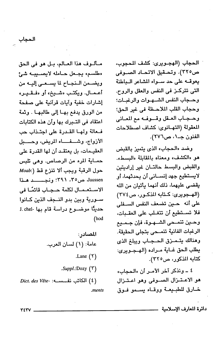4 - ونذكر آخر الأمر أن "الحجاب" هو الاعتزال الصوفى وهو اعتزال خارق للطبيعة ووقاء يسمو فوق مألوف هذا العالم، بل هو فى الحق "طلسم" يجعل حامله لا يصيبه شئ ويضمن النجاح لما يسعى إليه من أعمال. ويكتب "شيخ" أو "فقير" إشارات خفية وآيات قرآنية على صفحة من الورق يدفع بها إلى طالبها. وثمة اعتقاد فى التبرك بها وأن هذه الكتابات فعالة ولها القدرة على اجتذاب حب الأزواج، وشفاء المريض، وحبل العقيمات، بل يعتقد أن لها القدرة على حماية المرء من الرصاص. وهى تلبس حول الرقبة ويجب ألا تنزع قط (Moab: Jaussen، ص 35، 391؛ ونجد هذا الاستعمال لكلمة حجاب قائمًا فى سورية وبين بدو النجف الذين كانوا حديثًا موضوع دراسة قام بها J. chel- hod)