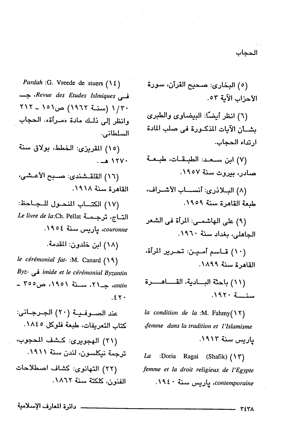 (14) Pardah: G. Vreede de stuers فى Revue des Etudes Islmiques, جـ 30/ 1 (سنة 1962) ص 151 - 212 وانظر إلى ذلك مادة "مرأة". الحجاب السلطانى.