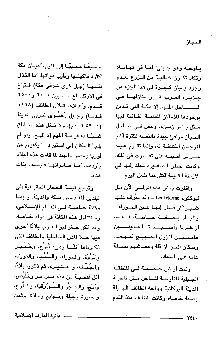يناوحه وهو جبلى؛ أما فى تهامة؛ وتكاد تكون خالية من الزرع لعدم وجود وديان كبيرة فى هذا الجزء من جزيرة العرب، فإن منازلها على الساحل اللهم إلا مكة التى تدين بوجودها للأماكن المقدسة القائمة فيها مثل بئر زمزم. وليس فى ساحل الحجاز مرافئ جيدة بالنسبة لكثرة آكام المرجان المكتنفة له، وإنما تقوم عليه مراس أمينة على تفاوت فى ذلك، وكانت السفن الصغيرة تخلد إليها فى الأزمنة القديمة أكثر مما تفعل اليوم.