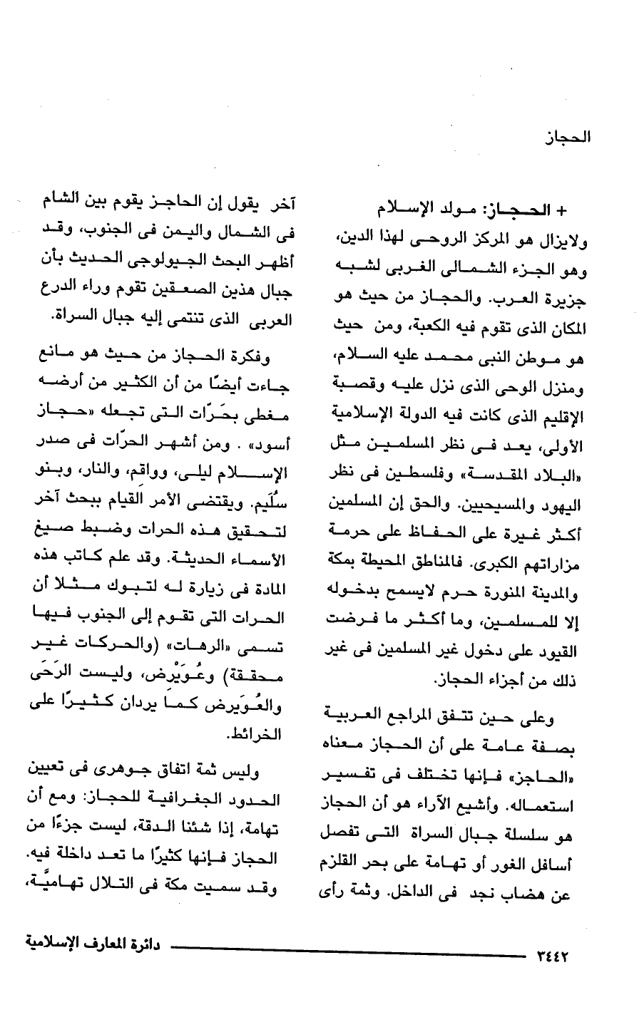ولا يزال هو المركز الروحى لهذا الدين، وهو الجزء الشمالى الغربى لشبه جزيرة العرب. والحجاز من حيث هو المكان الذى تقوم فيه الكعبة، ومن حيث هو موطن النبى محمَّد عليه السلام، ومنزل الوحى الذى نزل عليه وقصبة الإقليم الذى كانت فيه الدولة الإِسلامية الأولى، يعد فى نظر المسلمين مثل "البلاد المقدسة" وفلسطين فى نظر اليهود والمسيحيين. والحق إن المسلمين أكثر غيرة على الحفاظ على حرمة مزاراتهم الكبرى. فالمناطق المحيطة بمكة والمدينة المنورة حرم لا يسمح بدخوله إلا للمسلمين، وما أكثر ما فرضت القيود على دخول غير المسلمين فى غير ذلك من أجزاء الحجاز.