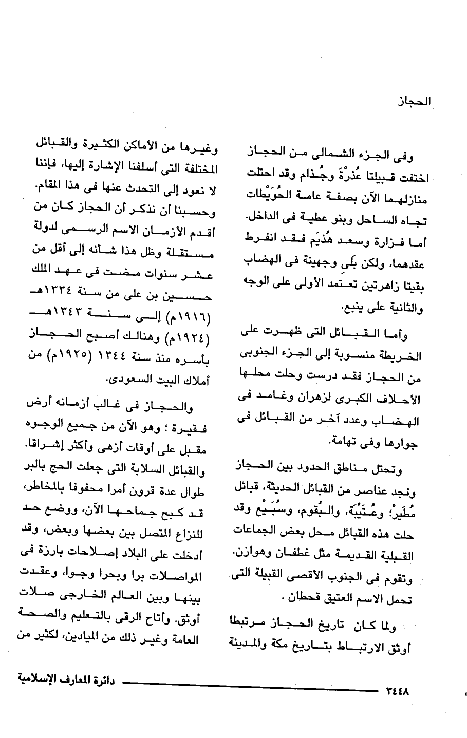 ولما كان تاريخ الحجاز مرتبطا أوثق الارتباط بتاريخ مكة والمدينة وغيرها من الأماكن الكثيرة والقبائل المختلفة التى اسلفنا الإشارة إليها، فإننا لا نعود إلى التحدث عنها فى هذا المقام. وحسبنا أن نذكر أن الحجاز كان من أقدم الأزمان الاسم الرسمى لدولة مستقلة وظل هذا شأنه إلى أقل من عشر سنوات مضت فى عهد الملك حسين بن على من سنة 1334 هـ (1916 م) إلى سنة 1343 هـ (1924 م) وهنالك أصبح الحجاز بأسره منذ سنة 1344 (1925 م) من أملاك البيت السعودى.