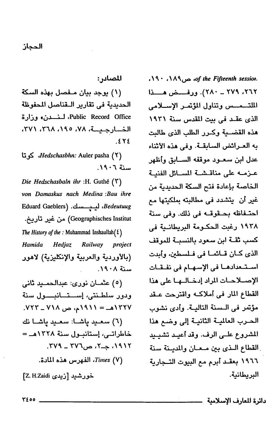 of the Fifteenth session, ص 189، 190، 262، 279 - 280). ورفض هذا الملتمس وتناول المؤتمر الإِسلامى الذى عقد فى بيت المقدس سنة 1931 هذه القضية وكرر الطلب الذى طالبت به العرائض السابقة. وفى هذه الأثناء عدل ابن سعود موقفه السابق وأظهر عزمه على مناقشة المسائل الفنية الخاصة بإعادة فتح السكة الحديدية من غير أن يتشدد فى مطالبته بملكيتها مع احتفاظه بحقوقه فى ذلك. وفى سنة 1938 رغبت الحكومة البريطانية فى كسب ثقة ابن سعود بالنسبة للموقف الذى كان قائما فى فلسطين، وأبدت استعدادها فى الإسهام فى نفقات الإصلاحات المراد إدخالها على هذا القطاع المار فى أملاكه واقترحت عقد مؤتمر فى السنة التالية. وأدى نشوب الحرب العالمية الثانية إلى وضع هذا المشروع على الرف. وقد أعيد تشييد القطاع الذى بين معان والمدينة سنة 1966 بعقد أبرم مع البيوت التجارية البريطانية.