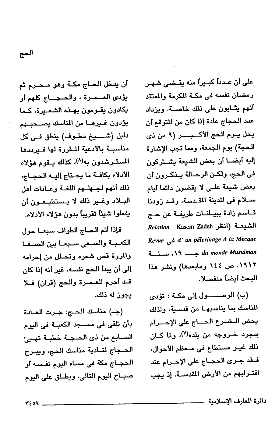على أن عددًا كبيرًا منه يقضى شهر رمضان نفسه فى مكة المكرمة والمعتقد أنهم يثابون على ذلك خاصة. ويزداد عدد الحجاج عادة إذا كان من المتوقع أن يحل يوم الحج الأكبر (9 من ذى الحجة) يوم الجمعة، ومما تجب الإشارة إليه أيضا أن بعض الشيعة يشتركون فى الحج، ولكن الرحالة يذكرون أن بعض شيعة على لا يقضون دائما أيام سلام فى المدينة المقدسة، وقد زودنا قاسم زادة ببيانات طريفة عن حج الشيعة (انظر Relation: Kasem Zadeh d' un pelerinage a la Mecque فى Revue du monde Musulman جـ 19، سنة 1912، ص 144 وما بعدها) ونشر هذا البحث أيضًا منفصلا.