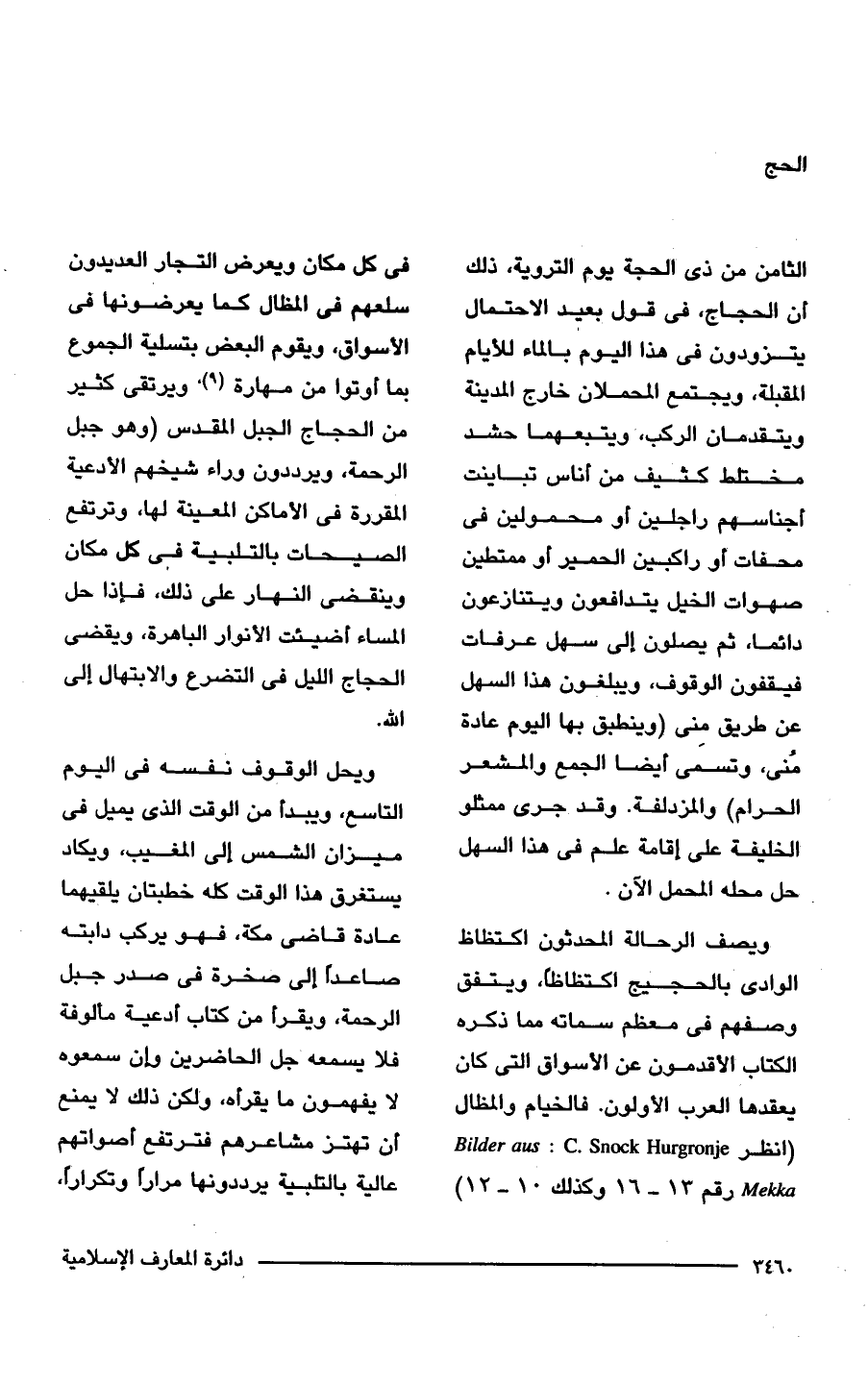 ويحل الوقوف نفسه فى اليوم التاسع، ويبدأ من الوقت الذى يميل فى ميزان الشمس إلى المغيب، ويكاد يستغرق هذا الوقت كله خطبتان يلقيهما عادة قاضى مكة، فهو يركب دابته صاعدًا إلى صخرة فى صدر جبل الرحمة، ويقرأ من كتاب أدعية مألوفة فلا يسمعه جل الحاضرين وإن سمعوه لا يفهمون ما يقرأه، ولكن ذلك لا يمنع أن تهتز مشاعرهم فترتفع أصواتهم عالية بالتلبية يرددونها مرارًا وتكرارًا،