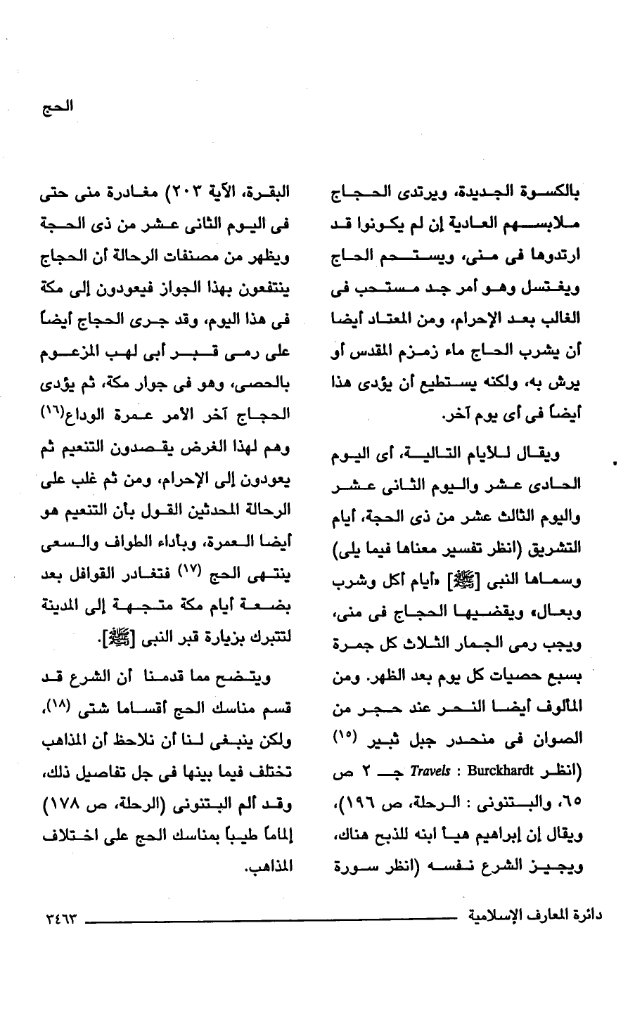 ويقال للأيام التالية، أى اليوم الحادى عشر واليوم الثانى عشر واليوم الثالث عشر من ذى الحجة، أيام التشريق (انظر تفسير معناها فيما يلى) وسماها النبى [- صلى الله عليه وسلم -] "أيام أكل وشرب وبعال" ويقضيها الحجاج فى منى، ويجب رمى الجمار الثلاث كل جمرة بسبع حصيات كل يوم بعد الظهر. ومن المألوف أيضًا النحر عند حجر من الصوان فى منحدر جبل ثبير (15) (انظر Travels: Burckhardt جـ 2 ص 65، والبتنونى: الرحلة، ص 196)، ويقال إن إبراهيم هيأ ابنه للذبح هناك، ويجيز الشرع نفسه (انظر سورة البقرة، الآية 203) مغادرة منى حتى فى اليوم الثانى عشر من ذى الحجة ويظهر من مصنفات الرحالة أن الحجاج ينتفعون بهذا الجواز فيعودون إلى مكة فى هذا اليوم، وقد جرى الحجاج أيضًا على رمى قبر أبى لهب المزعوم بالحصى، وهو فى جوار مكة، ثمَّ يؤدى الحجاج آخر الأمر عمرة الوداع (16) وهم لهذا الغرض يقصدون التنعيم ثمَّ يعودون إلى الإحرام، ومن ثمَّ غلب على الرحالة المحدثين القول بأن التنعيم هو أيضا العمرة، وبأداء الطواف والسعى ينتهى الحج (17) فتغادر القوافل بعد بضعة أيام مكة متجهة إلى المدينة لتتبرك بزيارة قبر النبى [- صلى الله عليه وسلم -].