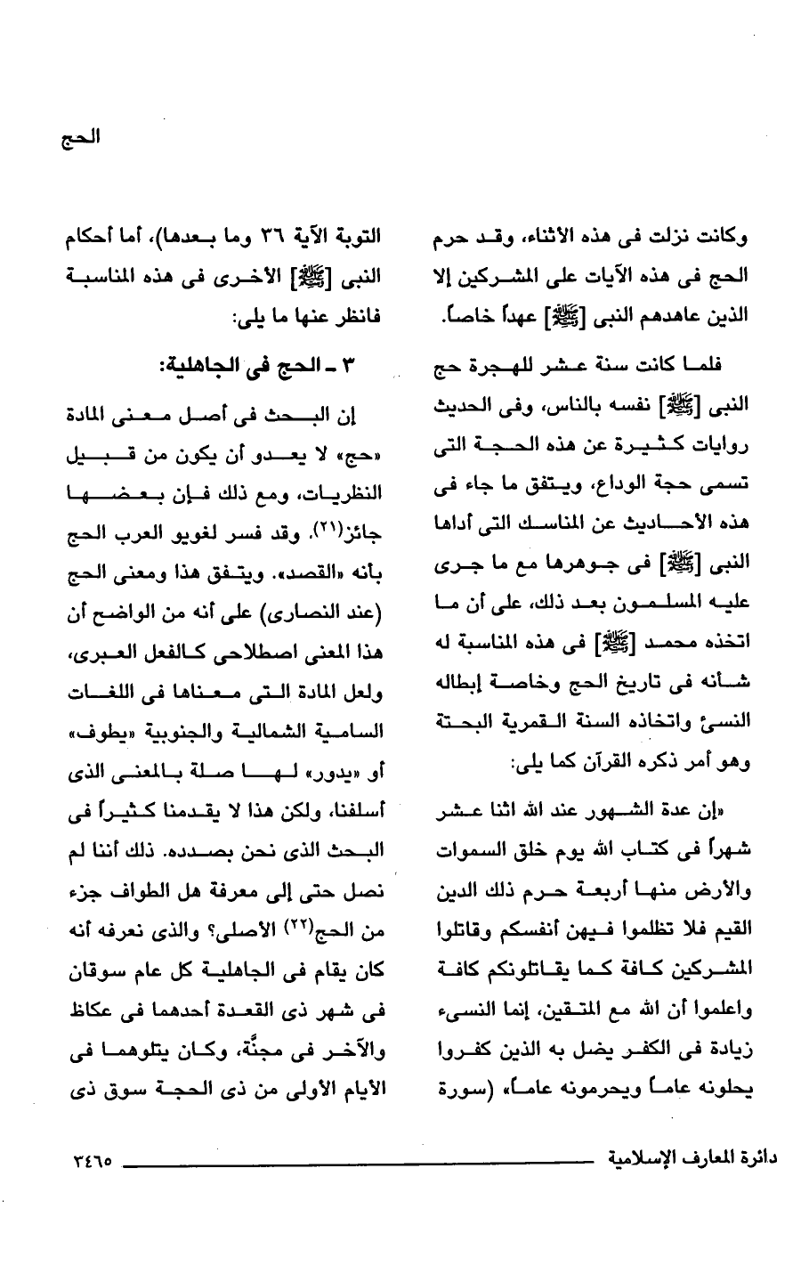إن البحث فى أصل معنى المادة "حج" لا يعدو أن يكون من قبيل النظريات، ومع ذلك فإن بعضها جائز (21). وقد فسر لغويو العرب الحج بأنه "القصد". ويتفق هذا ومعنى الحج (عند النصارى) على أنه من الواضح أن هذا المعنى اصطلاحى كالفعل العبرى، ولعل المادة التى معناها فى اللغات السامية الشمالية والجنوبية "يطوف" أو "يدور" لها صلة بالمعنى الذى أسلفنا، ولكن هذا لا يقدمنا كثيرًا فى البحث الذى نحن بصدده. ذلك أننا لم نصل حتى إلى معرفة هل الطواف جزء من الحج (22) الأصلى؟ والذى نعرفه أنه كان يقام فى الجاهلية كل عام سوقان فى شهر ذى القعدة أحدهما فى عكاظ والآخر فى مجنَّة، وكان يتلوهما فى الأيام الأولى من ذى الحجة سوق ذى