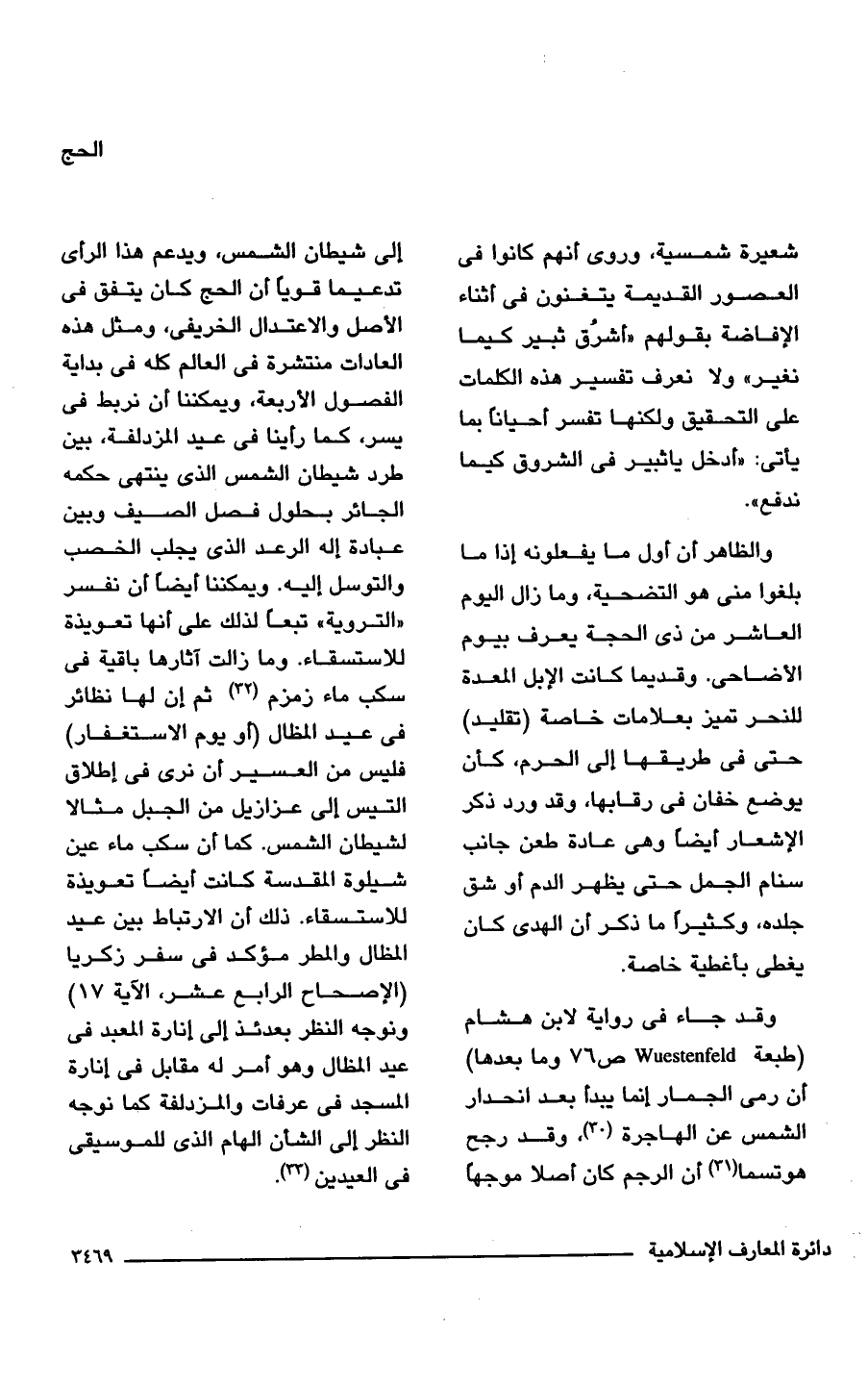 وقد جاء فى رواية لابن هشام (طبعة Wuestenfeld ص 76 وما بعدها) أن رمى الجمار إنما يبدأ بعد انحدار الشمس عن الهاجرة (30)، وقد رجح هوتسما (31) أن الرجم كان أصلا موجهًا إلى شيطان الشمس، ويدعم هذا الرأى تدعيما قويًا أن الحج كان يتفق فى الأصل والاعتدال الخريفى، ومثل هذه العادات منتشرة فى العالم كله فى بداية الفصول الأربعة، ويمكننا أن نربط فى يسر، كما رأينا فى عيد المزدلفة، بين طرد شيطان الشمس الذى ينتهى حكمه الجائر بحلول فصل الصيف وبين عبادة إله الرعد الذى يجلب الخصب والتوسل إليه. ويمكننا أيضًا أن نفسر "التروية" تبعًا لذلك على أنها تعويذة للاستسقاء. وما زالت آثارها باقية فى سكب ماء زمزم (32) ثمَّ إن لها نظائر فى عيد المظال (أو يوم الاستغفار) فليس من العسير أن نرى فى إطلاق التيس إلى عزازيل من الجبل مثالا لشيطان الشمس. كما أن سكب ماء عين شيلوة المقدسة كانت أيضًا تعويذة للاستسقاء. ذلك أن الارتباط بين عيد المظال والمطر مؤكد فى سفر زكريا (الإصحاح الرابع عشر، الآية 17) ونوجه النظر بعدئذ إلى إنارة المعبد فى عيد المظال وهو أمر له مقابل فى إنارة المسجد فى عرفات والمزدلفة كما نوجه النظر إلى الشأن الهام الذى للموسيقى فى العيدين (33).