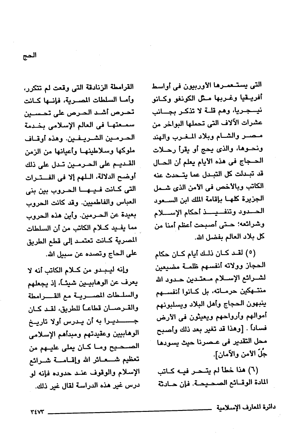 (6) هذا خطأ لم يتحر فيه كاتب المادة الوقائع الصحيحة. فإن حادثة القرامطة الزنادقة التي وقعت لم تتكرر، وأما السلطات المصرية، فإنها كانت تحرص أشد الحرص على تحسين سمعتها في العالم الإِسلامي بخدمة الحرمين الشريفين. وهذه أوقاف ملوكها وسلاطينها وأعيانها من الزمن القديم على الحرمين تدل على ذلك أوضح الدلالة، اللهم إلا في الفترات التي كانت فيها الحروب بين بني العباس والفاطميين. وقد كانت الحروب بعيدة عن الحرمين. وأين هذه الحروب مما يفيد كلام الكاتب من أن السلطات المصرية كانت تعتمد إلى قطع الطريق على الحاج وتصده عن سبيل الله.