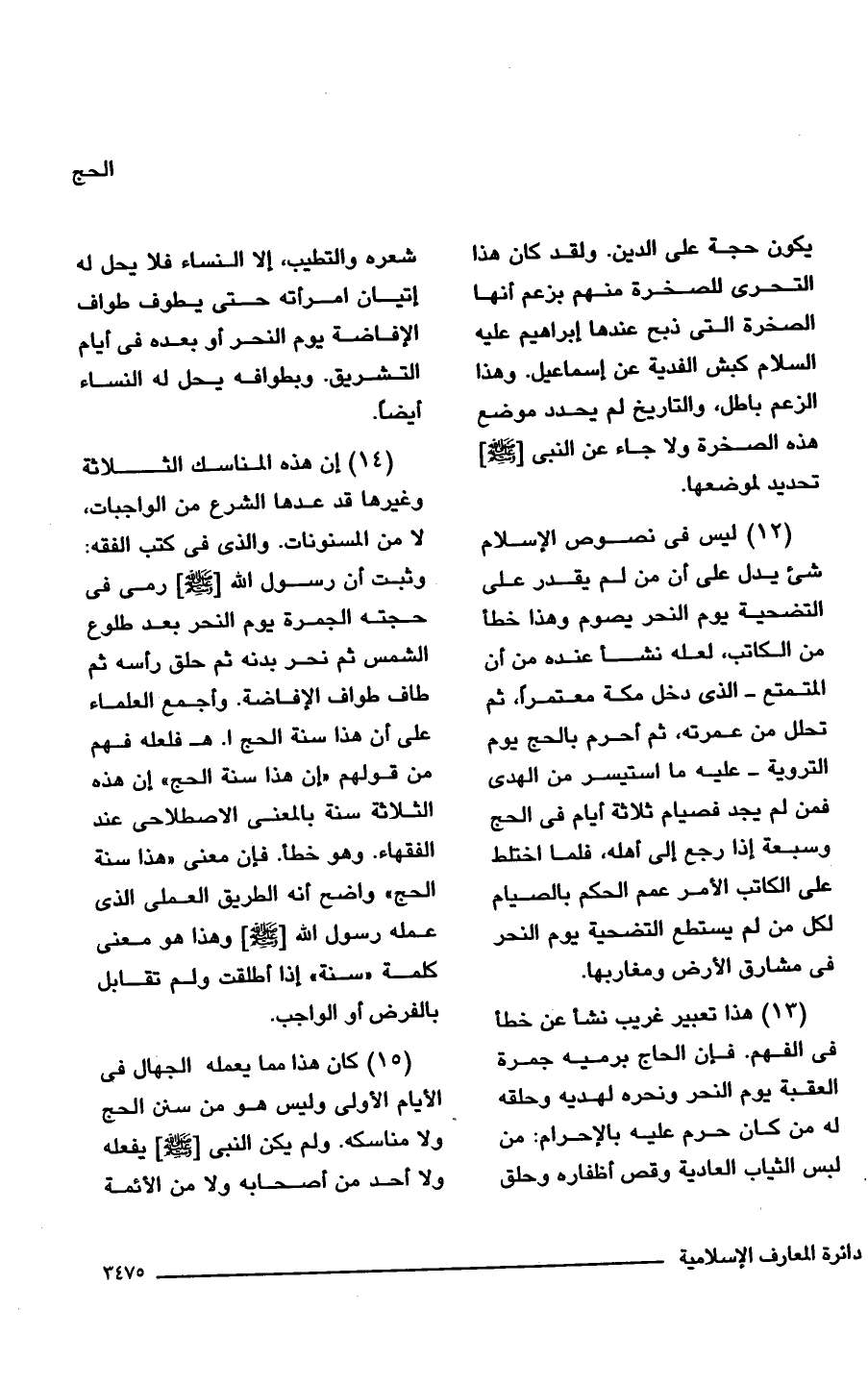 (14) إن هذه المناسك الثلاثة وغيرها قد عدها الشرع من الواجبات، لا من المسنونات. والذي في كتب الفقه: وثبت أن رسول الله [- صلى الله عليه وسلم -] رمى في حجته الجمرة يوم النحر بعد طلوع الشمس ثمَّ نحر بدنه ثمَّ حلق رأسه ثمَّ طاف طواف الإفاضة. وأجمع العلماء على أن هذا سنة الحج ا. هـ فلعله فهم من قولهم "إن هذا سنة الحج" إن هذه الثلاثة سنة بالمعنى الاصطلاحى عند الفقهاء. وهو خطأ. فإن معنى "هذا سنة الحج" واضح أنَّه الطريق العملى الذي عمله رسول الله [- صلى الله عليه وسلم -] وهذا هو معنى كلمة "سنة" إذا أطلقت ولم تقابل بالفرض أو الواجب.